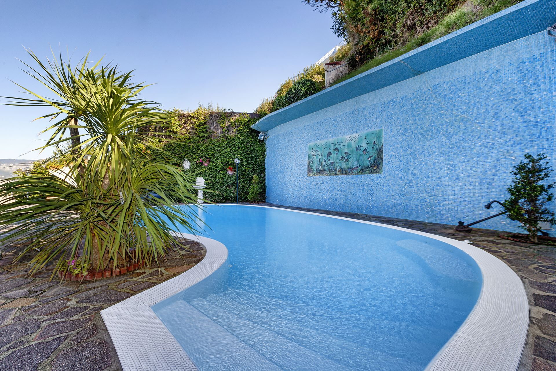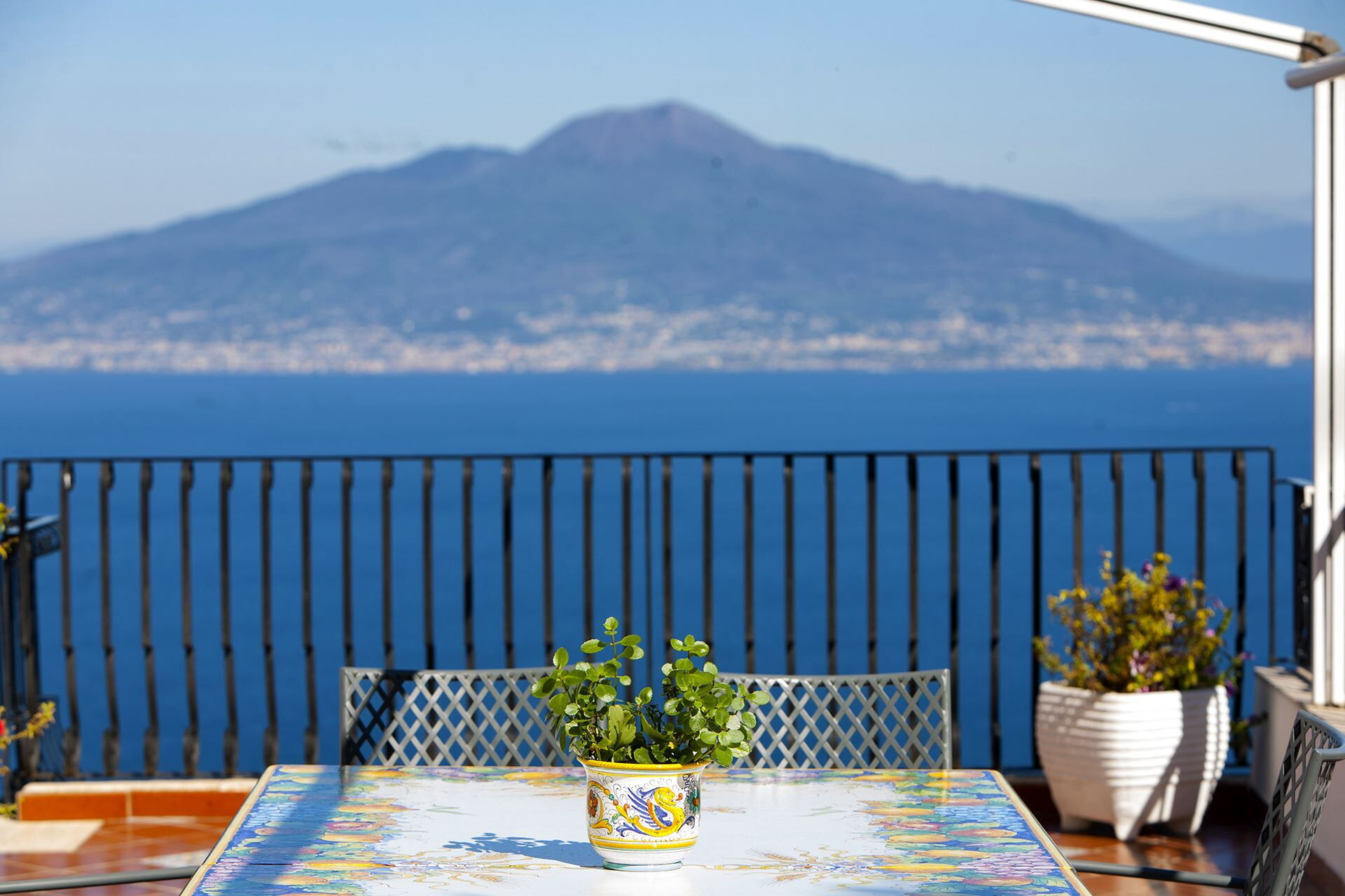 De buitenruimtes van Villa Flora omvatten ongeveer 400 vierkante meter terraswoonruimte verdeeld over meerdere niveaus. Het eerste terras beslaat 200 vierkante meter en is gedeeltelijk overdekt door een pergola, gemeubileerd met tafels, stoelen en ligstoelen waar u het spectaculaire uitzicht op de Golf van Napels en de Middellandse Zee kunt bewonderen. Het tweede terras meet 70 vierkante meter en beschikt over een grote eettafel met zitplaatsen voor 12 gasten, gedeeltelijk beschaduwd door een zonnescherm, direct toegankelijk via openslaande deuren vanuit de woonkamer. Een derde terras biedt extra ontspanningsruimte met zeezicht en dient als de ingang naar de slaapkamers in het bijgebouw. Het middelpunt van de buitenervaring is de 70 vierkante meter grote serre op de bovenste verdieping, voorzien van een kleine buitenkeuken met gootsteen, barbecuefaciliteiten en een traditionele pizzaoven, omgeven door comfortabele zit- en loungemeubels. Het zwembad meet 12 meter in lengte, 2,5 meter in breedte en 2,5 meter in diepte, gepositioneerd om het prachtige uitzicht op de zee en de Vesuvius te vangen. Het onverwarmde zwembad is beschikbaar van eind april tot begin november en is omgeven door ligstoelen en banken. Naast het zwembad vindt u een buitendouche met koud water en een badkamer uitgerust met een toilet en bidet. Toegang tot het zwembadgedeelte, het eerste terras en de serre vereist het beklimmen van 7 treden vanaf het hoofdniveau van de villa. De accommodatie is toegankelijk via een automatische poort vanaf de hoofdweg, met ongeveer 20 treden die het parkeergedeelte verbinden met de ingang van de villa.