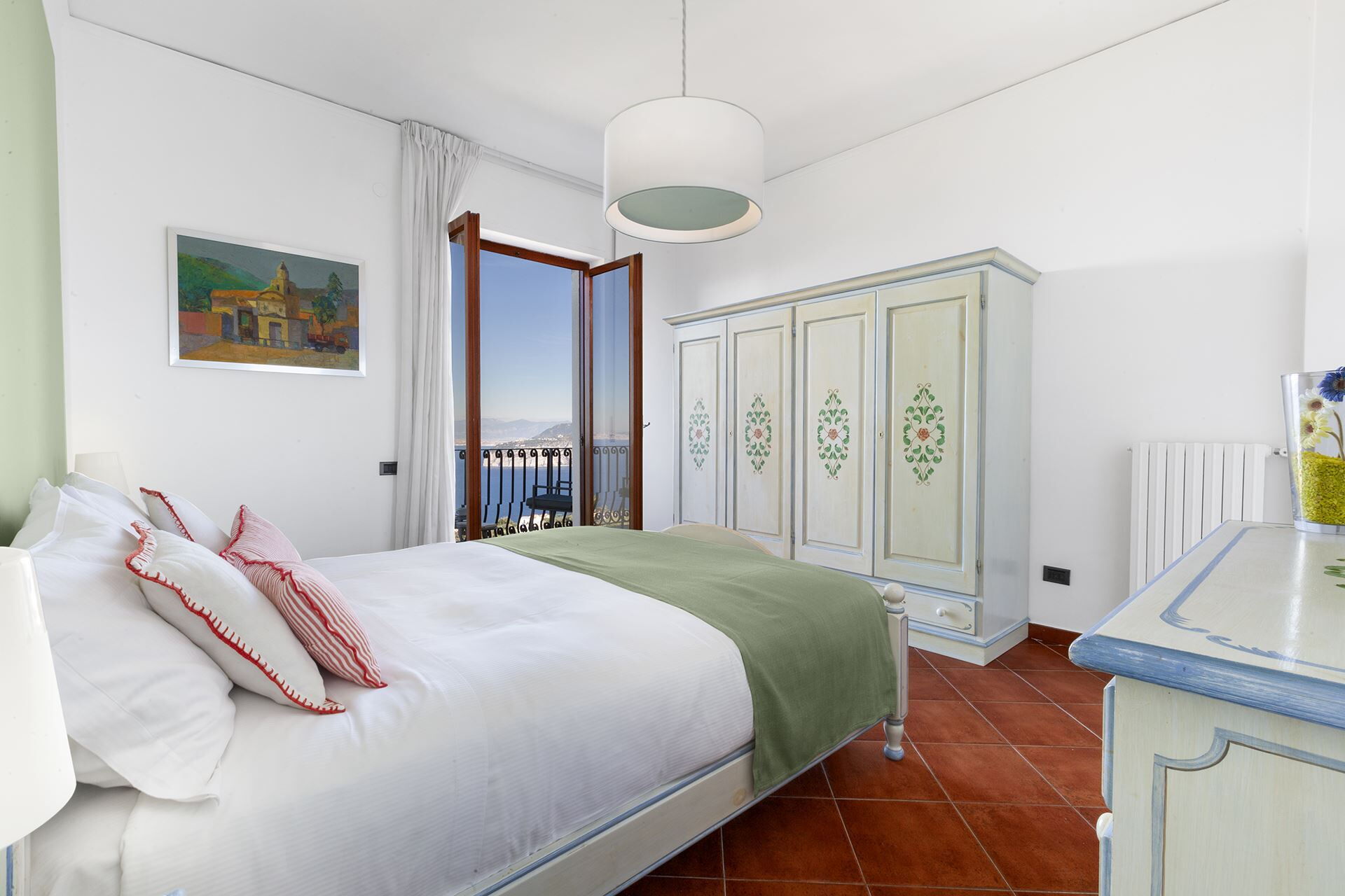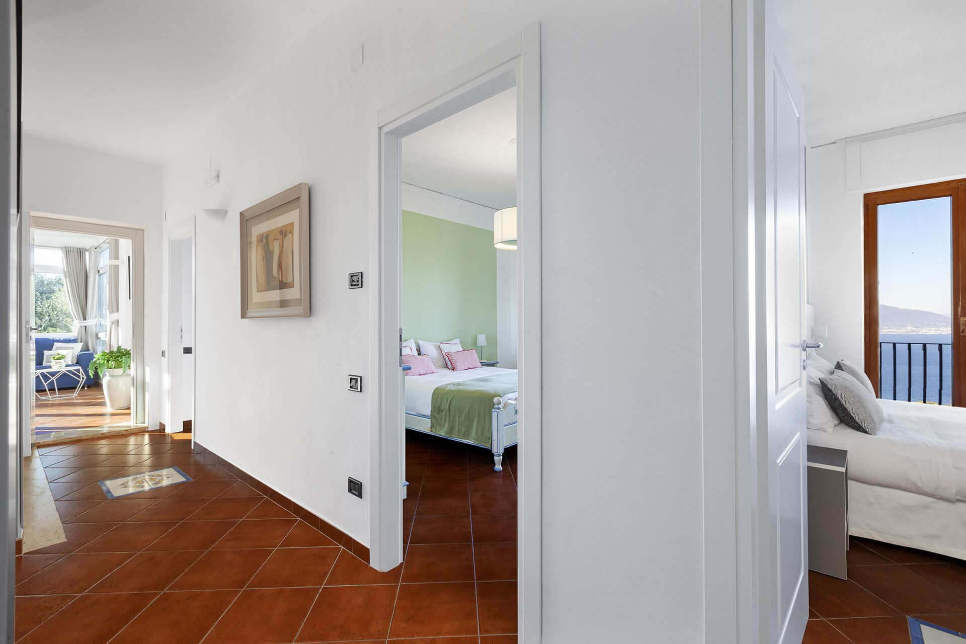Villa Flora biedt comfortabel accommodatie aan maximaal 10 gasten verdeeld over 5 slaapkamers en 4 badkamers, verdeeld over de hoofdvilla en een apart bijgebouw. De hoofdvilla beschikt over een ruime open woonkamer verdeeld in een loungegedeelte en keukenzone, met een eettafel met zitplaatsen voor 10 personen. Een aangrenzende veranda dient als extra woonruimte, gemeubileerd met een tweepersoons slaapbank, bank, twee fauteuils en een televisie. Drie tweepersoonsslaapkamers bevinden zich langs de gang van de hoofdvilla, elk met een tweepersoonsbed, kledingkast en bureau. Deze drie slaapkamers hebben gezamenlijk toegang tot een balkon van 12 vierkante meter gemeubileerd met een tafel, 3 stoelen en 2 banken, met uitzicht op de zee, Sorrento en de Vesuvius via openslaande deuren. Twee badkamers bedienen de hoofdvilla, de eerste met een wastafel, bidet, toilet, douchecabine en haardroger, terwijl de tweede is voorzien van een wastafel, bidet, toilet, bad met douche en haardroger, beide toegankelijk vanaf de gang. Het bijgebouw bestaat uit twee extra tweepersoonsslaapkamers, elk ingericht als een suite met ensuite badkamer. De vierde en vijfde slaapkamer bevatten elk een tweepersoonsbed, televisie, koelkast en een kleine barruimte uitgerust met een waterkoker en kopjes voor thee of koffie. Beide ensuite badkamers bevatten een wastafel, bidet, toilet, douche en haardroger. Deze slaapkamers in het bijgebouw zijn toegankelijk vanaf het derde terras via openslaande deuren. Een aparte wasruimte herbergt huishoudelijke apparaten.