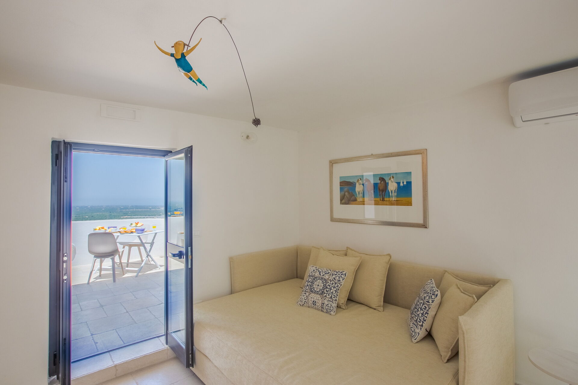 Slaapkamer: slaapbank, airconditioning, uitgang naar het balkon, uitgang naar het terras.