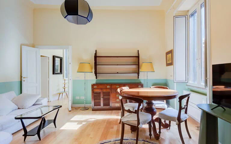 "Babuino", appartement 3-kamers 80 m2 op de 3e verdieping. Comfortabel ingericht: woon-/eetkamer met Sat-TV. 1 groot 2-pers. kamer. 1 kleine 2-pers. kamer. Kleine keuken (oven, afwasmachine, 4 kookpitten (vlammen), waterkoker). 2 douche/bidet/WC's. Gas-verwarming, air-conditioning. Verwarming alleen beschikbaar van 01.11. tot 15.04. Ter beschikking: wasmachine, strijkijzer, haardroger. Internet (WiFi, gratis). Niet rokers woning, geen parkeerplaats. IT058091C2YSQRPYR8
