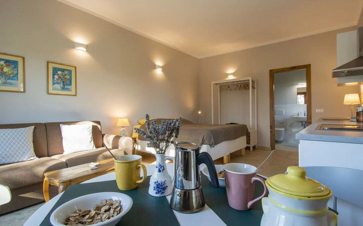 "Lavanda", Loft, 1-kamer op de begane grond. Modern en smaakvol ingericht: woon-/eetkamer met 1 divanbed en air-conditioning. 1 2-pers. kamer. Uitgang naar de tuin. Keuken (oven, 4 inductiekookplaten, broodrooster, waterkoker, magnetron). Douche/bidet/WC. Verwarming. Terrasmeubelen, ligstoelen. Mooi uitzicht in de verte op de tuin. Ter beschikking: wasmachine, kinderstoel, haardroger. Internet (WiFi). Maximaal 1 huisdier/hond toegestaan. IT048019C2KG90FH7Y