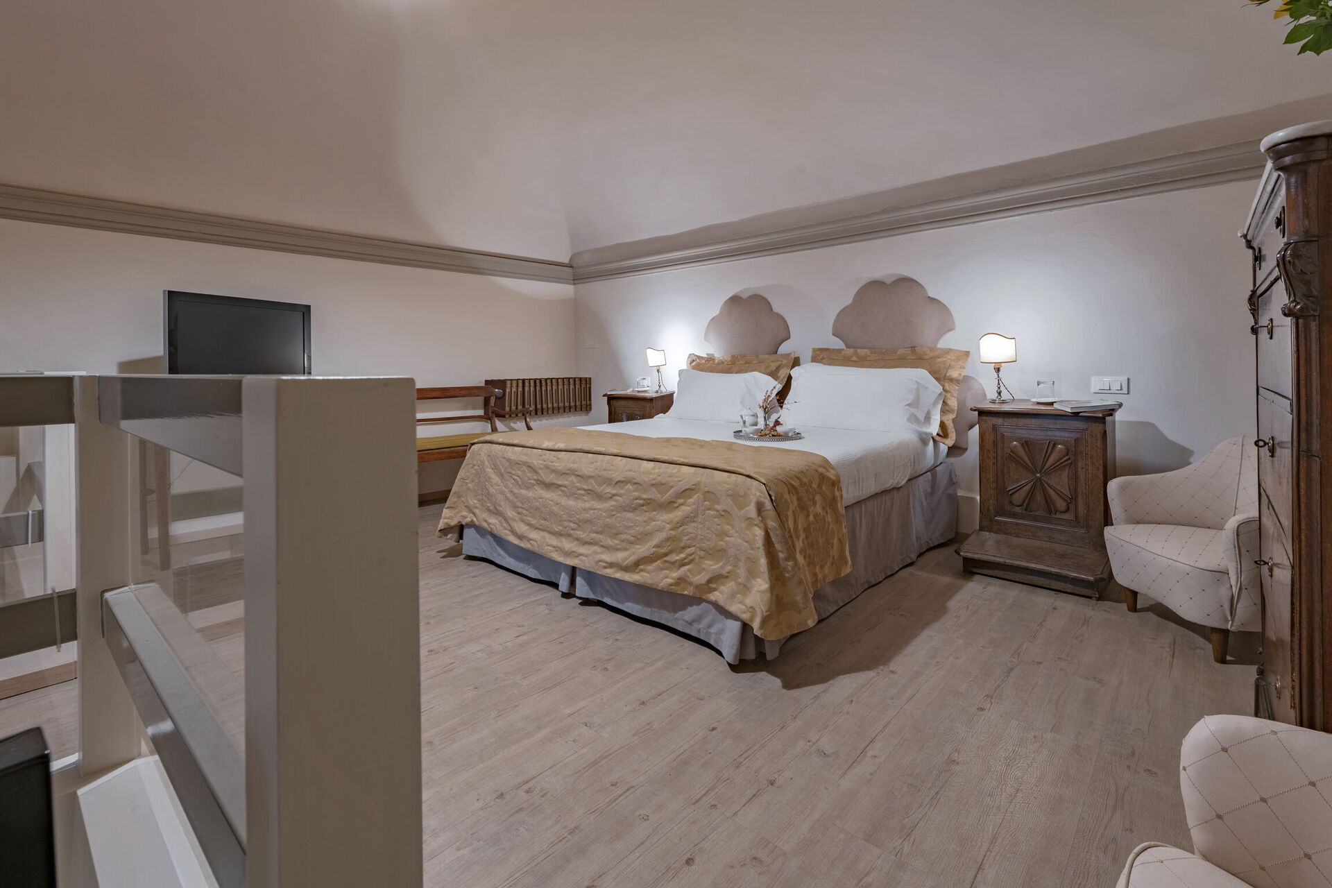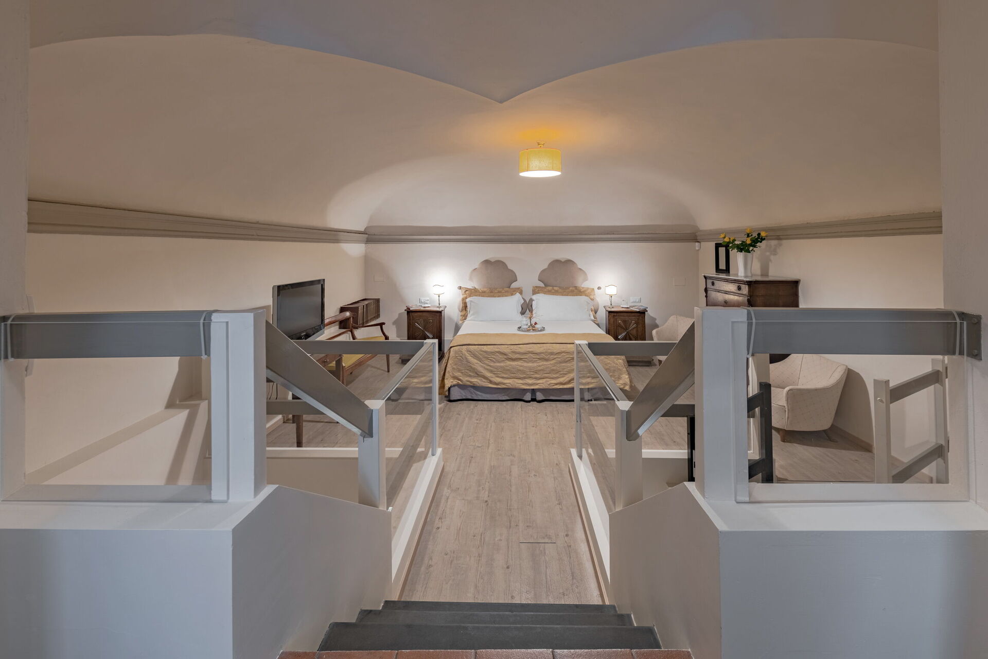 Slaapkamer met badkamer (16 m2): tweepersoonsbed (breedte: 160m, lengte: 210m), WIFI internet, airconditioning, fauteuil, bureau, wastafel, bidet, douche, vide.