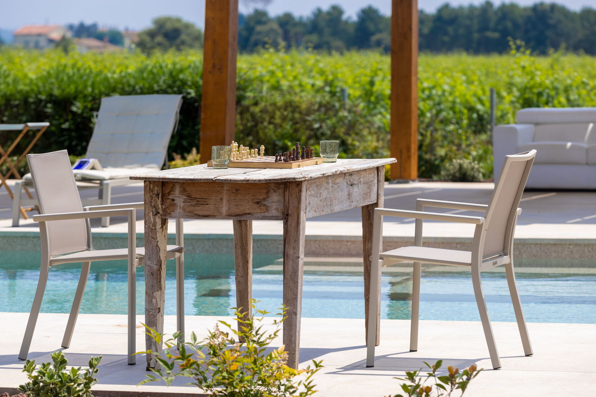Terras (60 m2): jacuzzi buiten, eettafel, WIFI internet, barbecue, tuinmeubilair, terrasmeubilair, tien ligstoelen.