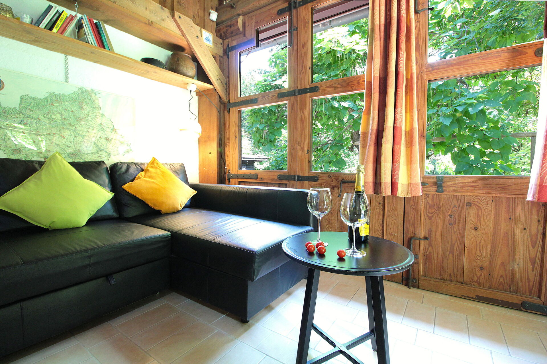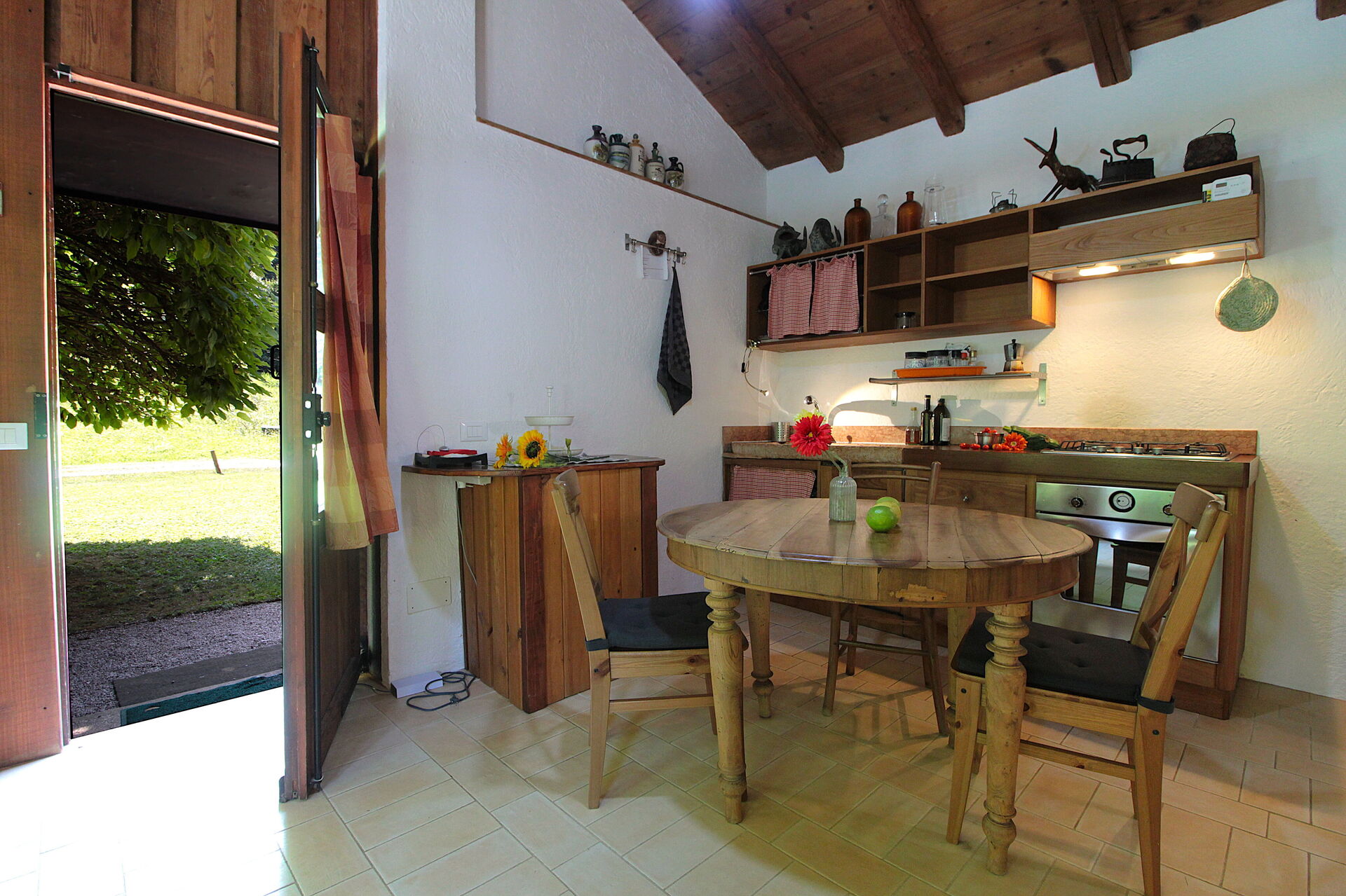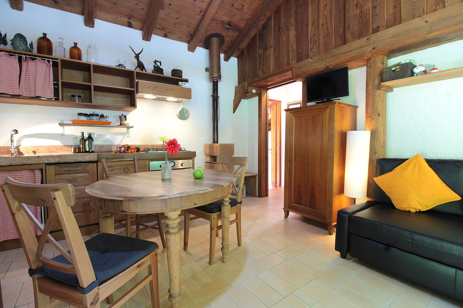 Keuken – woonkamer: goed uitgeruste keuken, eettafel, vaatwasser, ijskast, kookplaat, oven, italiaans koffiezetapparaat, tweepersoons-slaapbank, WIFI internet, tv.