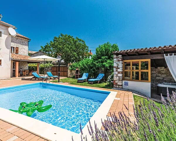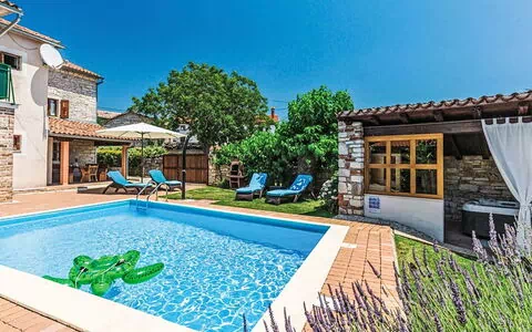 Rovinjsko Selo 6 km van Rovinj: Gezellige twee onder één kap woning "Matohanci", van 3 verdiepingen. In het gehucht Matohanci, 4 km van het centrum van Rovinjsko Selo, 7 km van het centrum van Kanfanar, rustige, zonnige ligging, 10 km van zee. Voor alleengebruik: terrein 300 m2 (omheind) met planten, openluchtzwembad hoekig (7 x 4 m, 110 - 135 cm diepte, seizoensgebonden beschikbaarheid: 01.Mei. - 30.Sep.). Buitendouche, hot tub, terras (12 m2), tuinmeubelen, barbecue. In het huis: internetaansluiting. Parkeerplaats (voor 2 auto's) bij het huis. Supermarkt 4 km, restaurant 50 m, bushalte 1 km, kiezelstrand 10 km, rotsstrand 10 km. Wandelroutes 50 m vanaf het huis, fietspad 100 m. Attracties in de buurt: Lim Bay 6 km. De eigenaar accepteert geen jeugdgroepen. De eigenaar woont op hetzelfde terrein. Vliegveld 48 km van het huis.