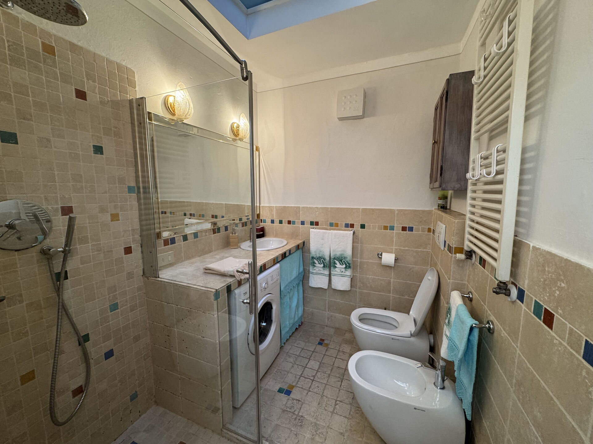 Badkamer: wastafel, toilet , bidet, douche, wasmachine.