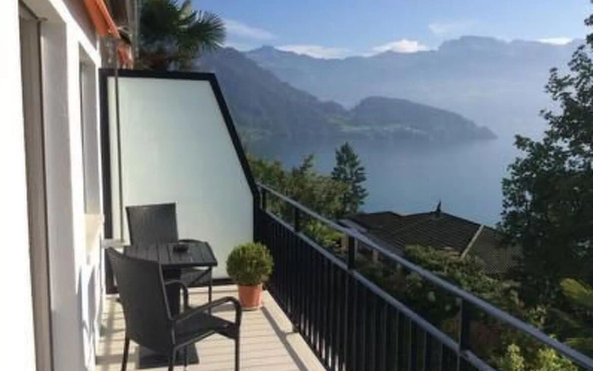 Perhaps the most beautiful view on the Swiss Riviera: small 2.5 room flat with large balcony high above Lake Lucerne. The view extends as far as Lucerne. A parking space is of course also included. Fully furnished with modern induction cooker, flatscreen TV, DVD/Blue-ray player, wireless LAN, Internet, small hallway and kitchen. There is a comfortable sofa bed in the living room, which can sleep two more adults if required. There is a double bed in the bedroom and, of course, the owners' association also has a washing machine and a separate drying room. The flat has a small garden with a barbecue and fantastic views. The newly renovated dream beach of Unterwilen is within walking distance. A dreamy bay with bathing island, barbecue, sun loungers and access to the lake. Perfect for a romantic picnic by the lake.Other sports and leisure facilities: Water skiing, sports boat, sailing boatSports facilities in the surrounding area: fishing, climbing, cycling tours, skiing (alpine), tennis