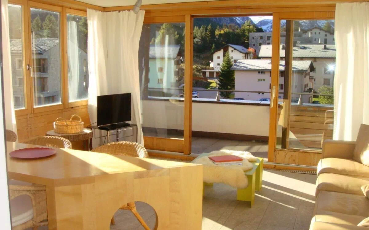 Two and a half room flat(55m2) for 2 till 4 persons, 2. floor, with balcony, direction south, view of the lake from living and sleeping room, absolutely quiet, newly renovated, very modern, Living room with sofa and a big table, sleeping room, kitchen with dishwasher, oven, bath/toilette, radio, satellite television and telephone, free Wi-Fi. PUBLIC TRANSPORT INCLUDED in the Upper Engadine and in the Bergell area. Dogs are welcome. The apartment is located in the House Capricorn. The property has an elevatorRegistration is at the reception desk of the Hotel Schweizerhaus, there you get the key and all information. For the Capricorn guests there is in the basement of Aparthotel Pöstli – just nearby - a sauna and a finarium (with supplement) and fitness room (free of charge). We offer on request bread service alsoA Kiosk = the Maloja Shop is located also at the Pöstli, where you can buy daily newspapers, books, souvenirs, as well as cake and a lot of other things. Only 60m further away there is a small grocery store. The bus stop is only 200m away, the bus runs every half hour during the day. Outdoor parking is available for free or there is the possibility to rent a place in the garage.Other leisure facilities: adventury parcour, snow-tubing, vita parcourOther living room features (Living room1): very modern and quite, view to the lake, big balcony to the southOther bedroom furniture (Bedroom1): very modern, view to the lake, very quiteOther kitchen equipment (Kitchen1): water-boilerNearby sports facilities: Fishing, Mountain climbing, Ice skating, Golf course, Climbing, Mountainbiking, Paragliding, Bike tours, Toboggen, Rowing, Skiing (alpin), Cross-country skiing, Sport center, Surfing, Tennis, SailingLocation description: Maloja - The artistic village inspired the pass The Italian-Swiss border, in Maloja you breathe a simple atmosphere, the genius of the famous painter and the beauty of nature and culture of a village on the pass. The fascinating play of light and shadows of the landscape has always attracted many artists. Giovanni Sengantini himself chose Maloja as his final resting place and a souce of inspiration and subject for many of his works. Even Giovanni Giacometti, the father of Alberto Giacometti, worked and painted in Maloja, and his artistic spirit still inspires today exhibitions, conferences and concerts. The village on the pass, on the border with authentic Bergell, is appreciated by walkers, art and families. The offer for the latter in particular is widely treated: Schweizerhaus hotel you can book the course of pizza for children, the adventure park "Capel – the smugglers' route" you can live adventures set in a beautiful landscape, the children playground “Kukuk” is suitable for large and small and in Lake Cavloccio, at 1907 meters above sea level, you can make even the bath.