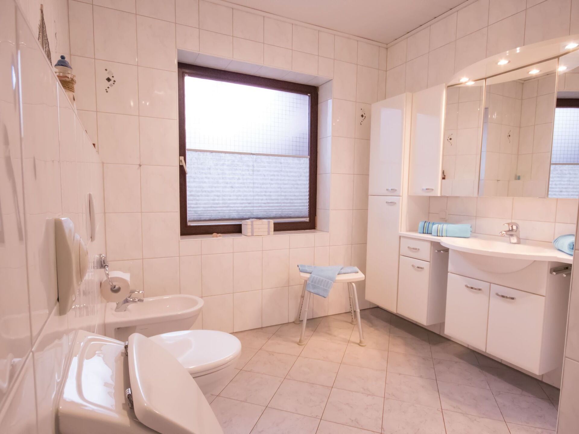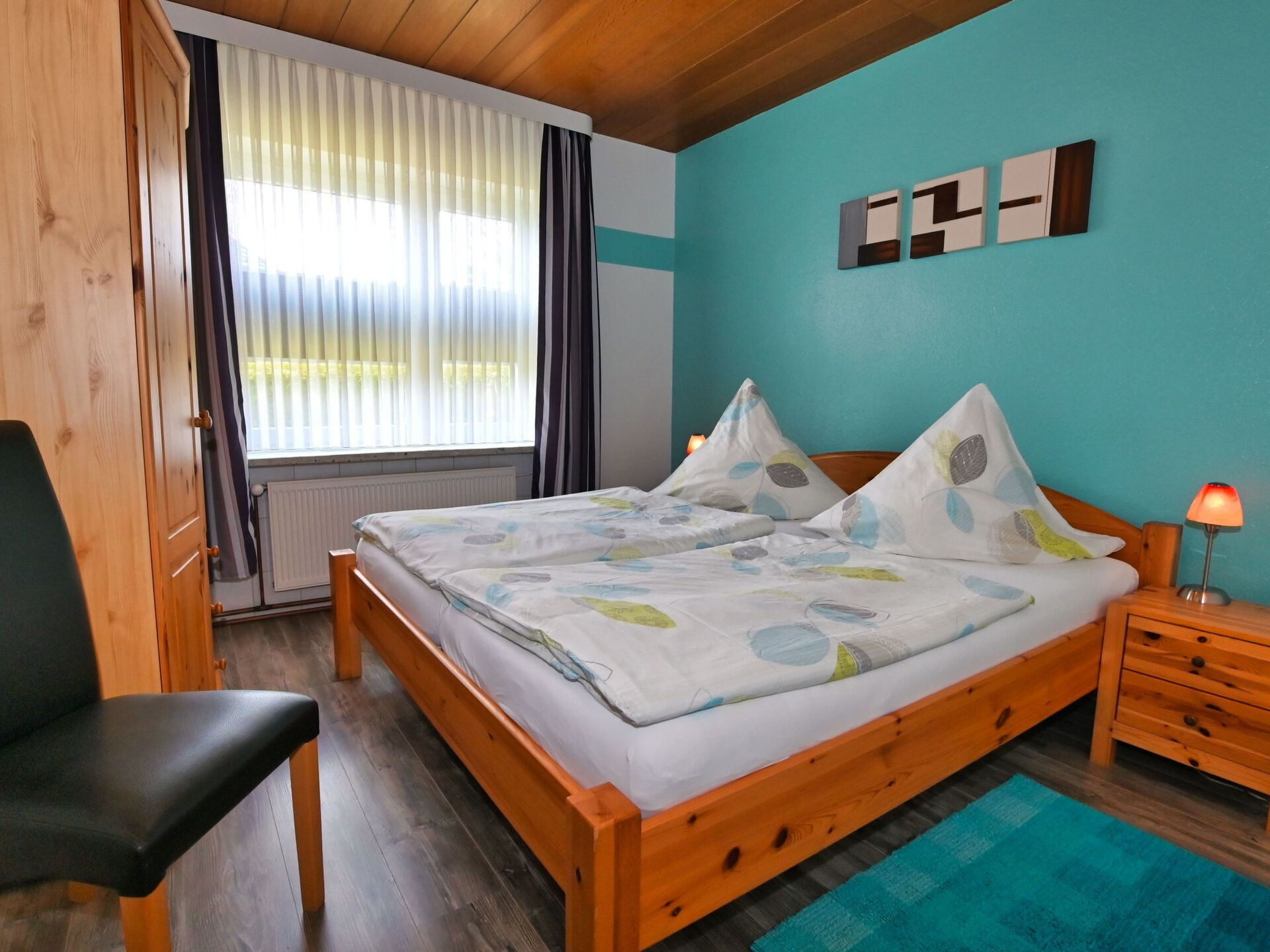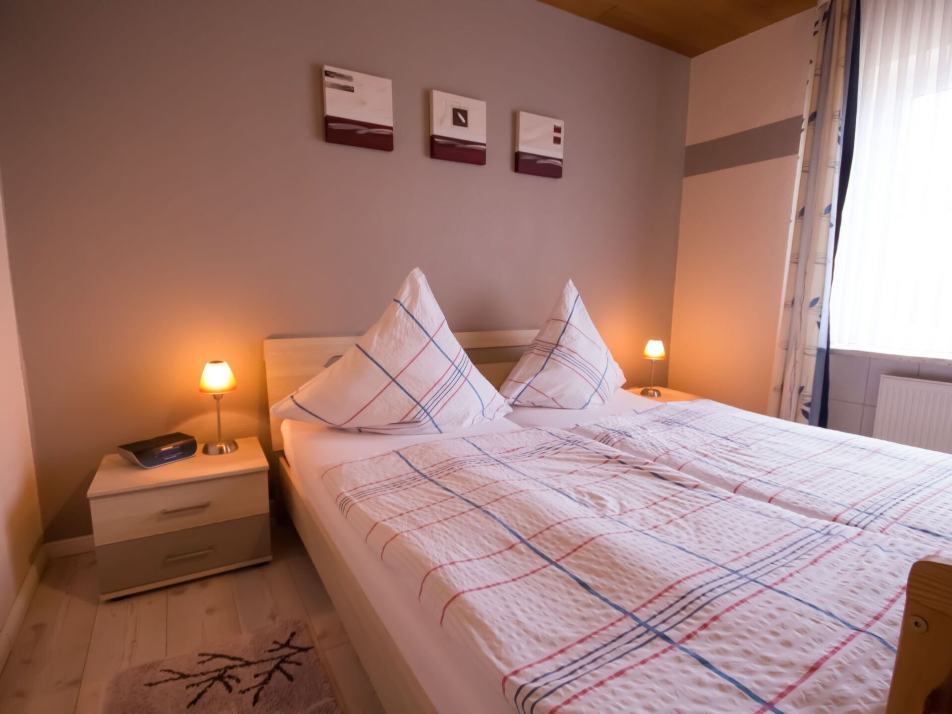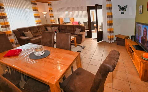 This flat is centrally located in Büsum and the beach and town centre are within easy walking distance.The 4-room flat has a living space of approx. 125 m². The friendly and comfortably furnished holiday accommodation extends over the entire ground floor. The modern living and dining area has a corner sofa with ottoman and coffee table, a floor lamp and a sideboard with a 50-inch flat-screen TV. There is also a dining table with six chairs. In addition to the above-mentioned equipment, the fully equipped kitchen also has an oven and a dishwasher. There is also a further dining area for two people. A high chair for children is available free of charge if required. The first bedroom is furnished with two single beds (0.90 x 2.00 m each). A CD player, a 23-inch TV and a stool round off the furnishings in this sleeping area. The second bedroom has a double bed (1.80 x 2.00 m) and an optional cot (0.70 x 1.40 m) for free use, as well as a clock radio and a stool. The third bedroom also has a double bed (1.80 x 2.00 m) with a stool provided. Compared to the other flats, this bathroom also has underfloor heating, a towel radiator as well as a urinal, bidet and shower stool. The separate guest WC is equipped with a washbasin, toilet and mirror. In the storage room there is a washing machine for your exclusive use free of charge, as well as a clothes horse, ironing board, iron and hoover. You will find a cloakroom, a wardrobe and a mirror in the hallway. We have free W-Lan for you. We assume no liability for failures and malfunctions.The conservatory offers you a beautiful view of the garden and is furnished with a large table and six chairs, an armchair, a sideboard with satellite TV and a games console. Outside, there is a small garden and a terrace with garden furniture for your exclusive use. There is room for up to six people at the table under the electric awning. A barbecue is also provided. There is no possibility to charge an electric car as the house electricity is not designed for this purpose.There are three holiday flats in the house with different sizes and furnishings.Shopping facilities for household goods and clothing are about one kilometre away and a bakery is about 800 metres away.