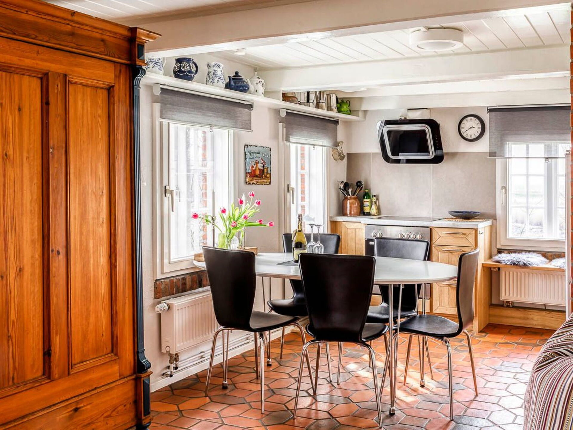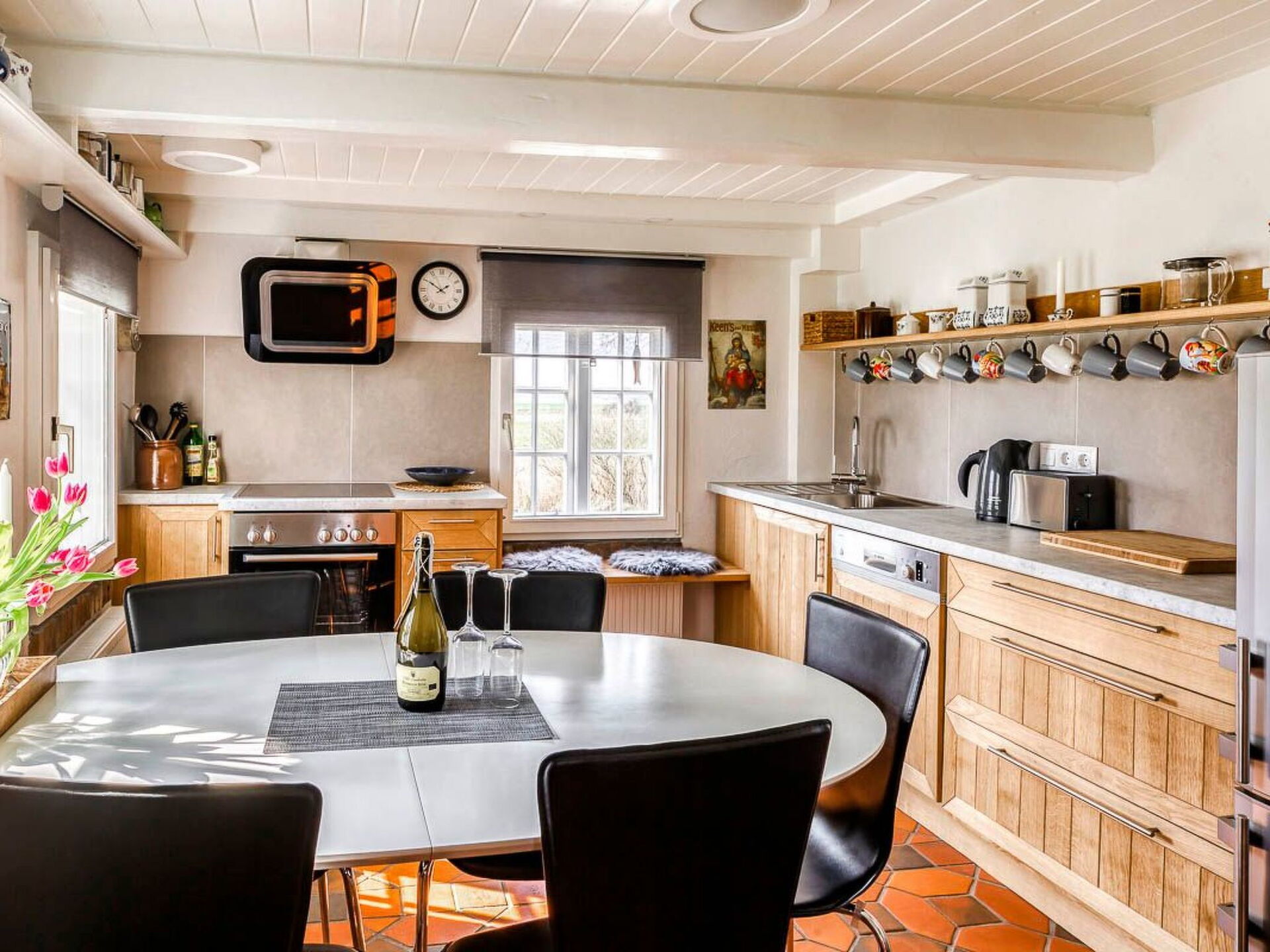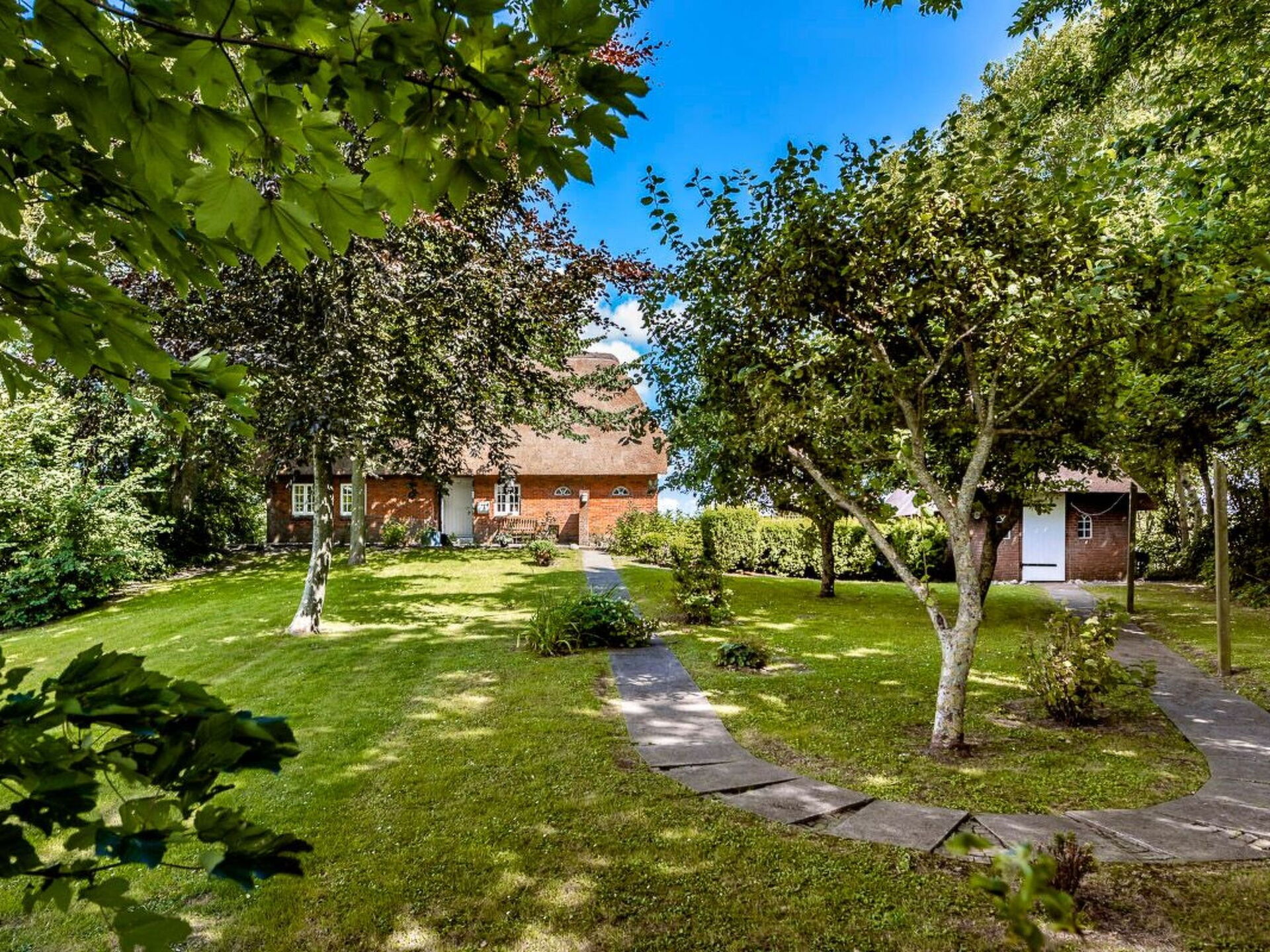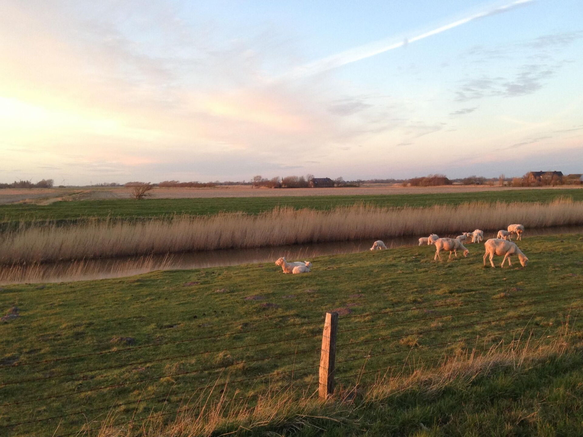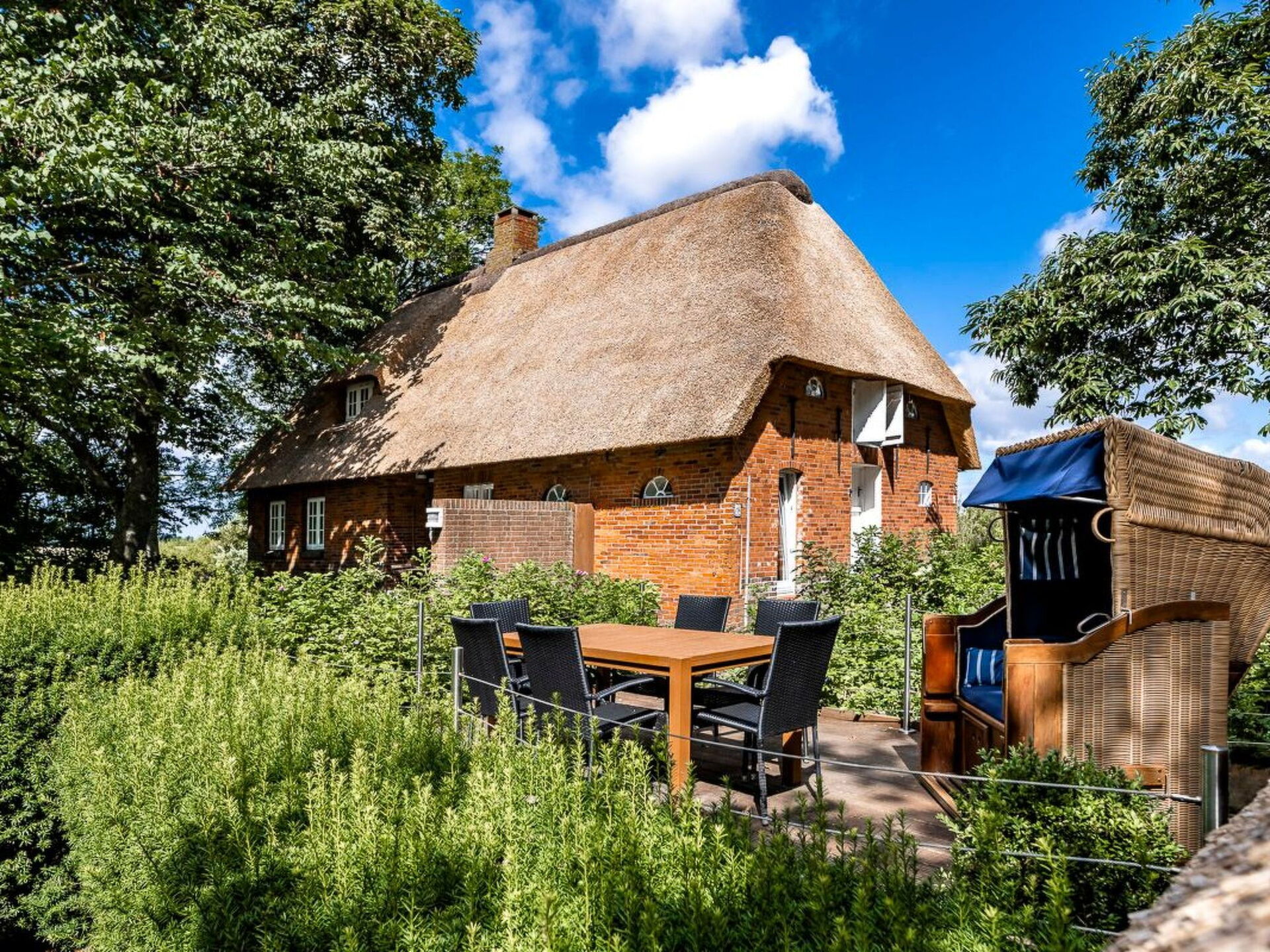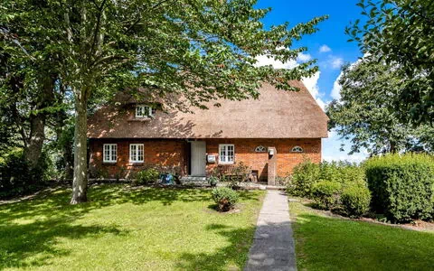 Maximaal 3 huisdieren/honden toegestaan. This idyllic non-smoking thatched house built in 1850 and extensively renovated in 2019 is on the edge of the Gotteskoog in the North Frisian marsh by the tidal flats in Schleswig-Holstein, in the midst of meadows and fields.There is a terrace outside with garden furniture and a thatched garage. The site is on an old embankment in the second row to an outer embankment. The mature trees provide shelter from wind and weather. Dogs can run around freely. The site is enclosed by a fence and is a protection for your dog.Up to six people can be accommodated comfortably in this charmingly furnished holiday house and the house is also suitable for a holiday with a dog. The ground floor comprises a hallway, bedroom, wardrobe, living and dining room, kitchen and a bathroom with sauna. Stairs lead to the upper floor. The hallway forms a little bridge with a lovely view of the ground floor. The upper floor has three bedrooms and another bathroom with toilet and washbasin. The living and dining room provides a dining table, a desk, a Sat-TV, a Bluetooth music system and a telephone for free mainline calls. The kitchen is equipped with an electric stove with an oven, a microwave, coffee machine, pads coffee machine, fridge and freezer, dishwasher, sink, toaster and other everyday utensils. The bathroom has a washbasin, a shower, a toilet, a hairdryer and a sauna. Two bedrooms are each furnished with two single beds (90 x 200cm), extendable to a double bed, and are on the west side and one bedroom with a double bed (180 x 200cm) is on the east side of the house. Note that it has sloped ceilings.Spend your family holiday in Emmelsbüll-Horsbüll and make the most of the attractive location for interesting trips in the region, with easy access to Husum, Flensburg, Friedrichstadt or Tonder in Denmark. Go on a trip to the North Sea islands Anrum, Föhr, the Halligen or Romo, explore the cycling and hiking trails of the Frisian marsh, explore the tidal flats or relax on one of the clean swimming beaches in the region.There is a separate entrance to a utility room with a washing machine and dryer. A highchair, a cot and wireless Internet access are available. There are six bicycles available for free use. The thatched roof ensures a pleasant indoor climate. Gas central heating was installed in 2015. In the first quarter of 2019 an extensive renovation was made.