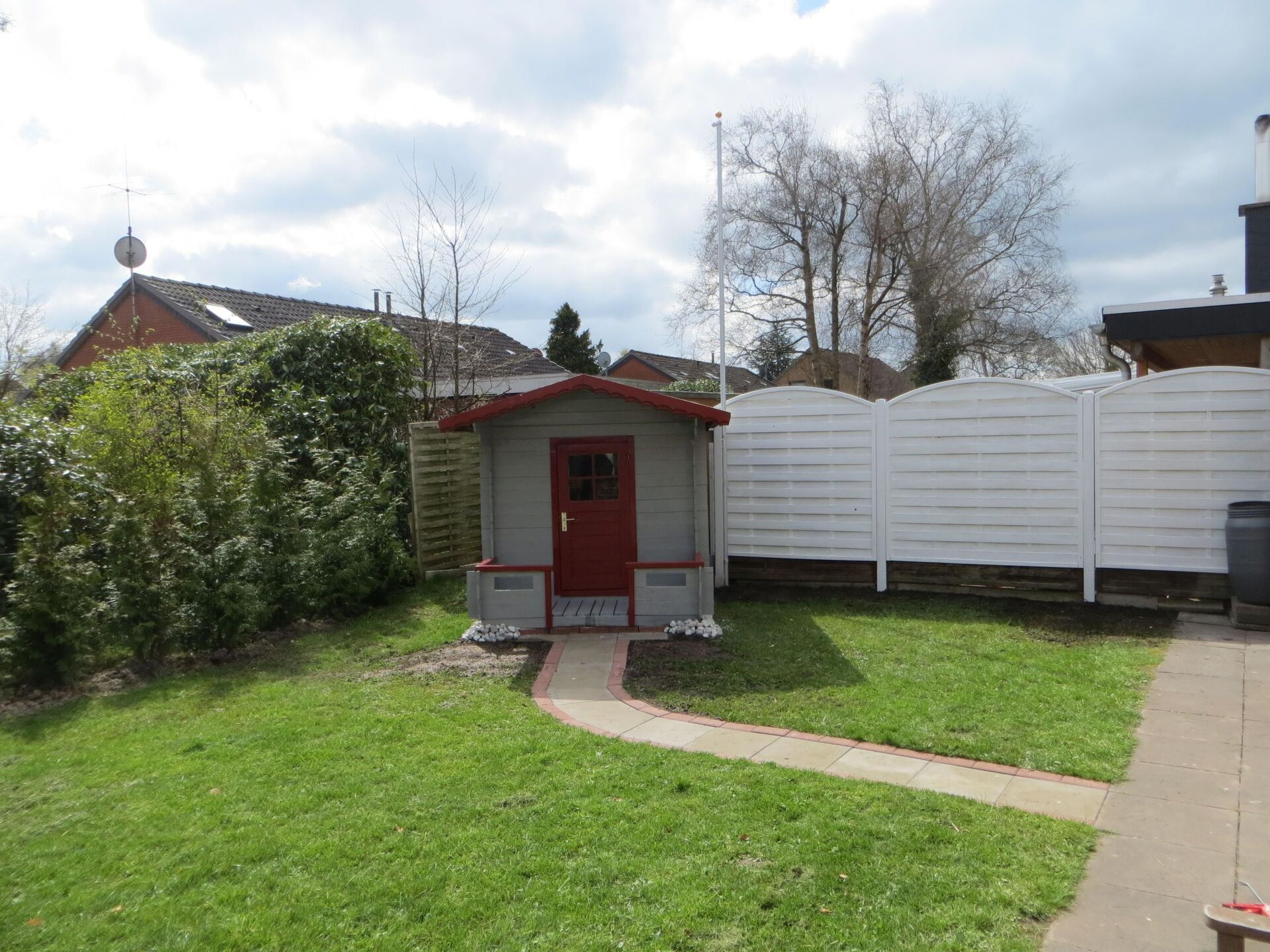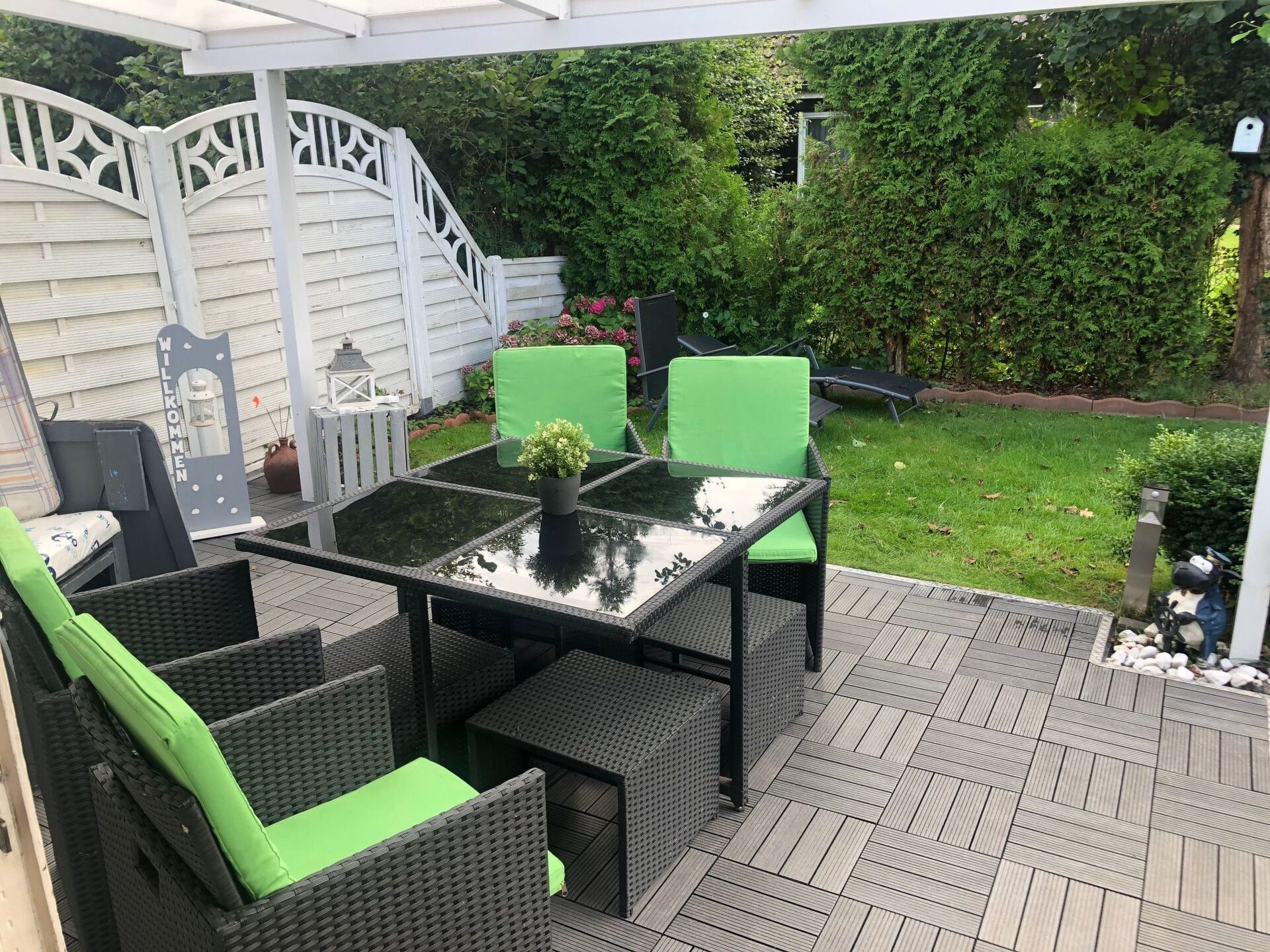 The first bedroom (12m²) has a double bed (180 x 200) with two 7-zone single mattresses and a satellite TV (flat screen 32 inch) as well as a large sliding door wardrobe. The second bedroom (8m²) has a double bed (180 x 200) with two 7-zone single mattresses) and a wardrobe. From the hallway you reach a multi-purpose room with washing machine and dryer. The enclosed garden (south facing) with covered terrace with wooden tiles has a 4-seater rattan seating area, beach chair, parasol and sun loungers including barbecue. In front of the house there is a front garden, carport and another parking space.