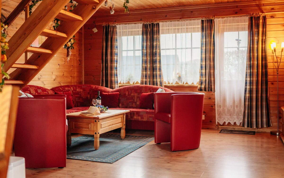 Maximaal 3 huisdieren/honden toegestaan. Quiet cul-de-sac just a few metres from woods and meadows. Hiking trails start almost on the doorstep.3 - The log cabin has a living space of approx. 70 m² and is designed for 2 to a maximum of 6 people. There is a kitchen, bathroom and living room on the ground floor and 2 bedrooms upstairs.The open-plan kitchen with dining area adjoining the living area is equipped with- ceramic hob- oven- dishwasher- 30 litre freezer compartment- large fridge- toaster- Coffee machine + Nespresso Vertuo capsule machine- electric kettle- sufficient cutlery and crockery.The large living room has direct access to the terrace. It is equipped with a large flat screen TV, radio and CD/DVD player.There are also some DVDs, games and books for the little ones.Both bedrooms are on the first floor and have a small balcony. The first bedroom is furnished with a large double bed - there is also a sofa bed that can comfortably accommodate two people. In the second bedroom you will find 2 comfortable single beds.The bathroom has a shower and is a daylight bathroomThe garden of the holiday home is completely fenced in with an approx. 80 cm high fence. Garden furniture is available free of charge. The south-facing orientation means you can enjoy the sun almost all day long.Since April 2020 you are welcome to arrive by e-car we have installed a calibrated 22 kw charging station on site.Dogs are very welcome here We are happy to provide you with dog bowls and a dog blanket free of charge - just let us know when bookingFor the little ones we have some DVDs, games and books available.We are happy to provide a travel cot and a high chair free of charge - just let us know when you book.ATTENTION: The additional costs (costs on site) such as final cleaning, dog, laundry package, visitor's tax and deposit etc. must be paid before the start of the holiday.