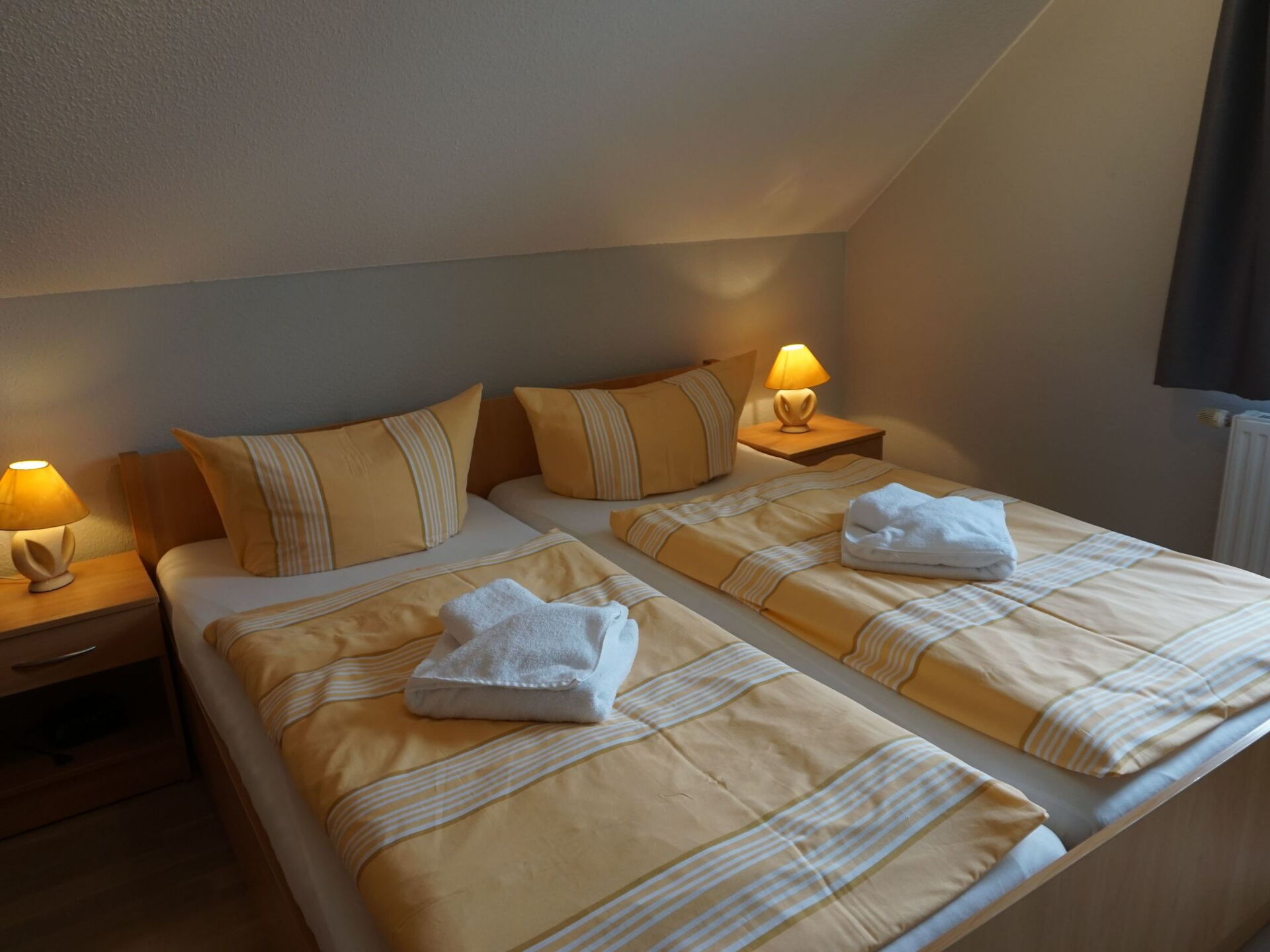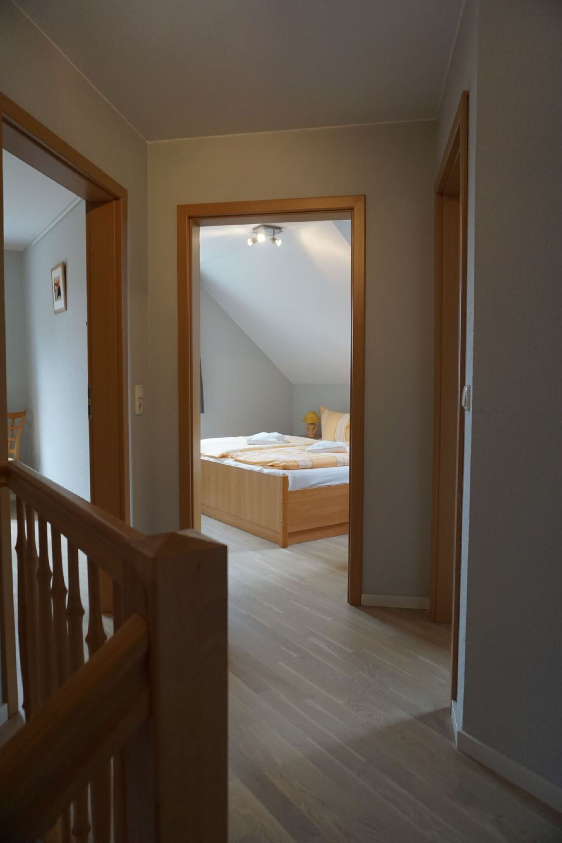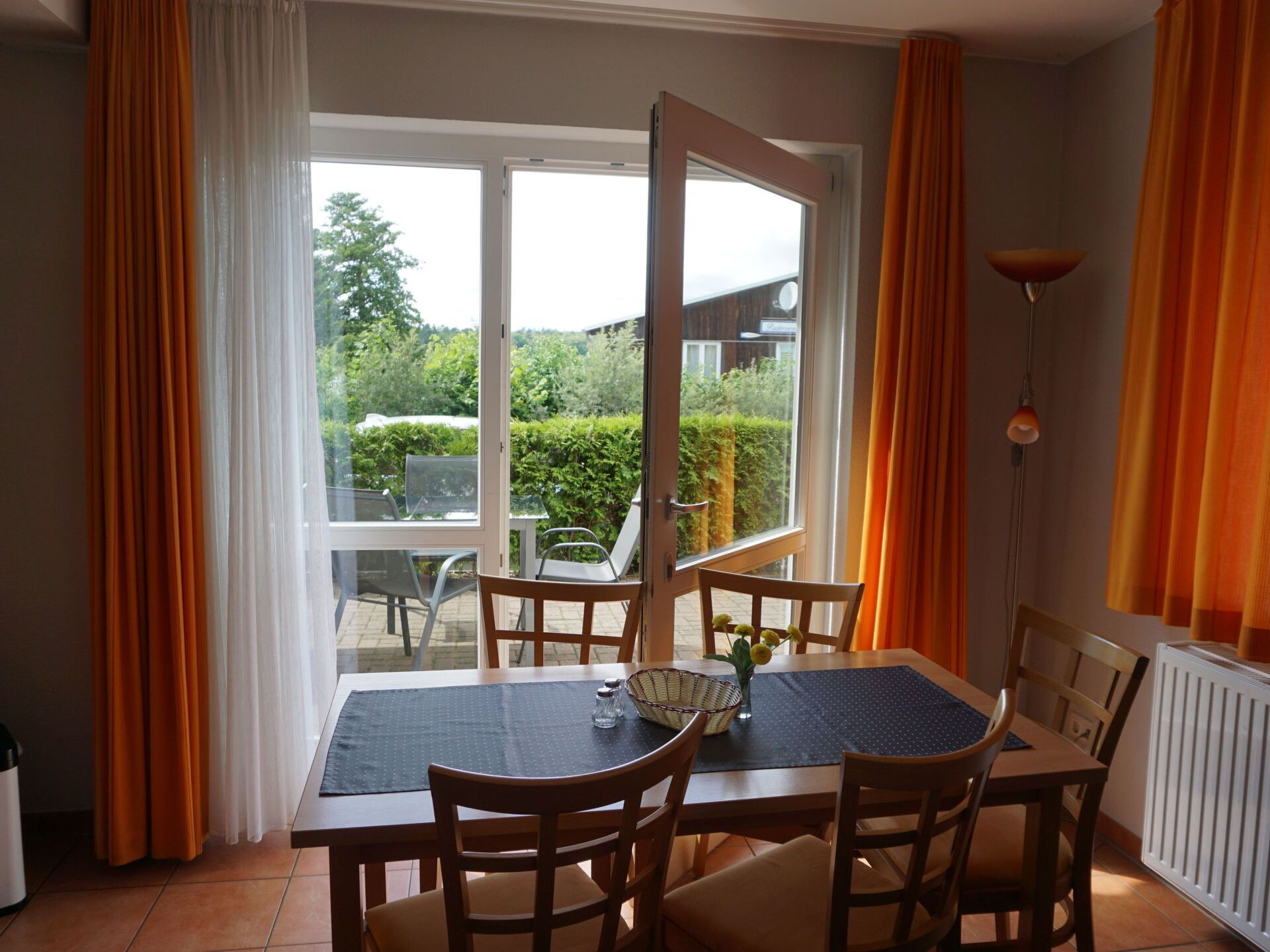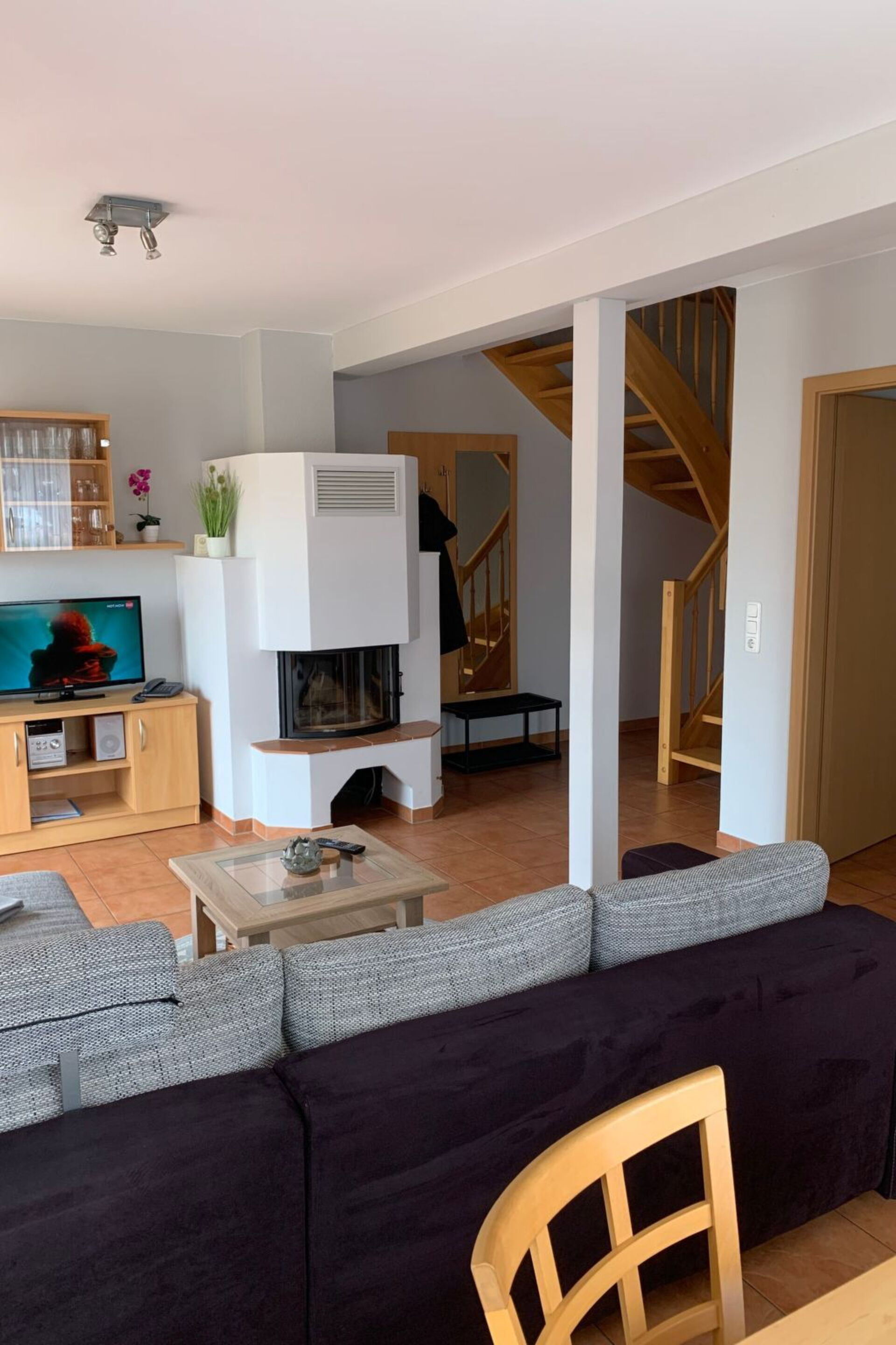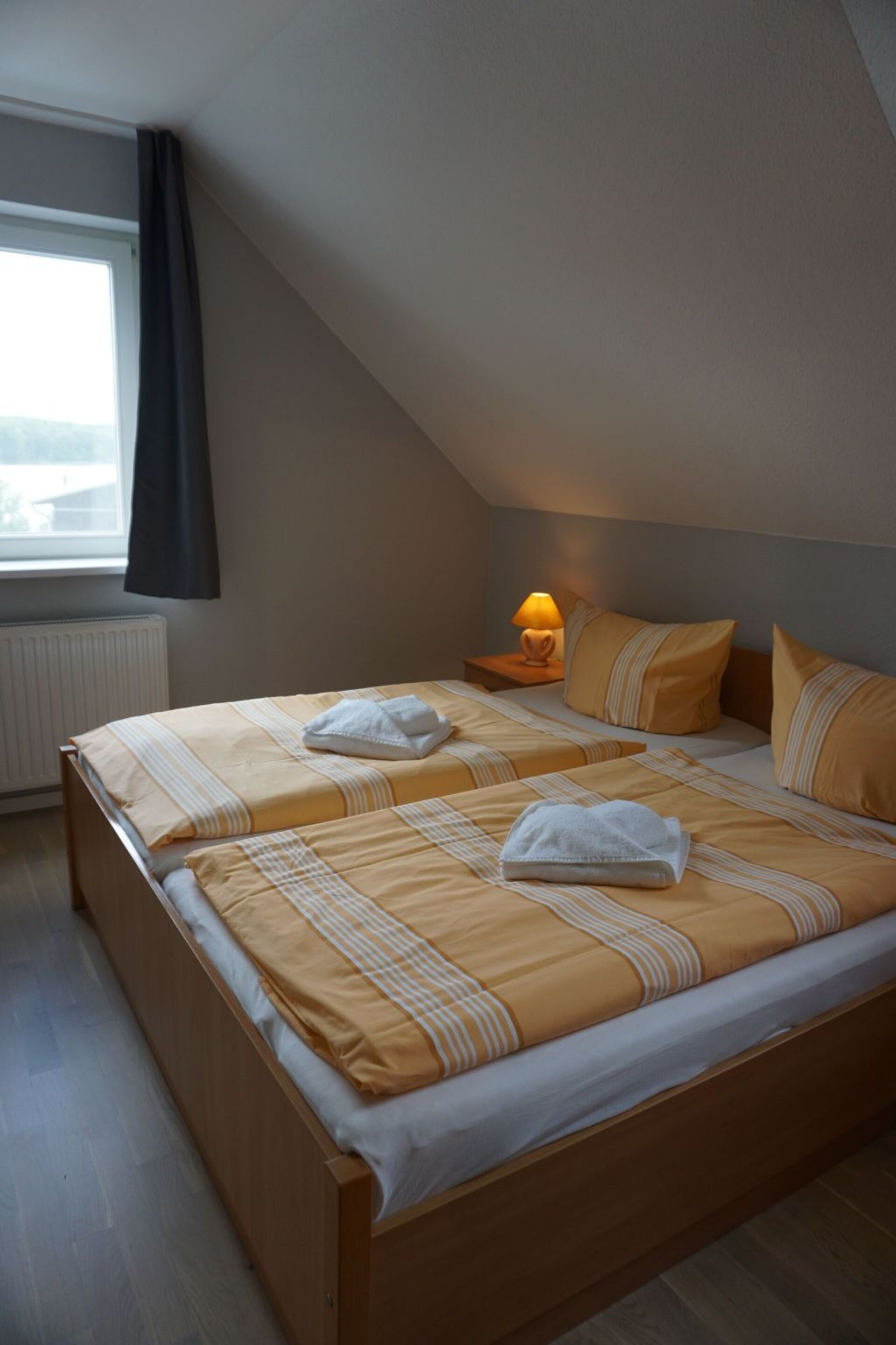 Maximaal 2 huisdieren/honden toegestaan. The maisonette flat is located in the neighbouring building. The size of this maisonette is 80 m² and has a living area with living room and open-plan kitchen, three bedrooms, which are reached by a spiral staircase, and a bathroom. Two bedrooms are furnished with two double beds (190 cm x 200 cm each) and the third has a bunk bed with two single beds (90 cm x 180 cm). You have a direct view of the lake from the bedrooms on the 1st floor. The kitchen is fully equipped with an oven, freezer, hob, fridge, dishwasher, toaster and kettle. In the living area you will find a seating area with chairs and a table and a sofa set. Here you can listen to music on the stereo system and use the flatscreen TV. The fireplace in the living area adds to the cosiness. The bathroom has a shower, washbasin and WC.There is a view of the lake from the terrace.