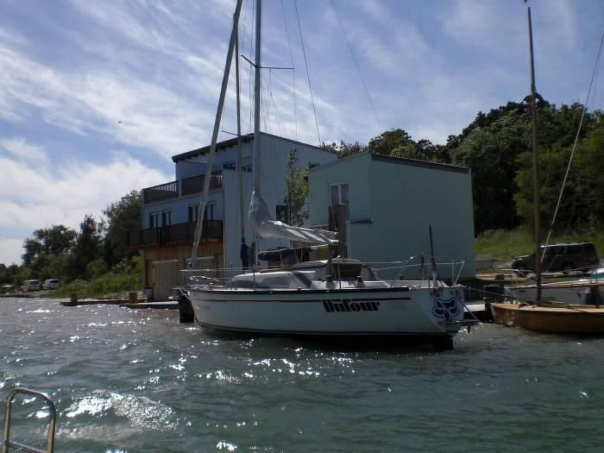Maximaal 2 huisdieren/honden toegestaan. This holiday home is located on the outskirts of Kahnsdorf, directly on Lake Hain, and just a few kilometres south of Leipzig. You will find peace and relaxation here, but you can also quickly reach the big city.The holiday home is equipped like a complete family home as a non-smoking building. You are welcome to smoke on the balconies and terraces. The house stands in the lake on concrete pillars that are set about four metres into the lake bed. This means that access to the house is on land and access to the lake is directly in the water. All guests can expect a lovingly designed interior with selected decorations. On the ground floor is the boat garage with its own rowing boat for four people (included in the rental price); you can take the boat under the house through a gate onto the lake, electric barbecue and leisure games for guests are also available. There is also a hallway with shoe cupboard and cloakroom, WC with wash hand basin and toilet and a utility room with house connections and small tools. On the first floor you enter the living room with flat screen TV, DVD or Blu Ray player with several DVDs, radio-CD system, sofa bed (can be folded out for one person to sleep on), books to browse through and board games. The kitchen with dining table and four chairs is also located here. It has a fridge, freezer, microwave, kettle, toaster, coffee machine, dishwasher, oven, four-burner electric hob and extractor bonnet. All cutlery, crockery, pliers, scissors and openers are provided. The floor is rounded off by a bathroom with a large shower, toilet and washbasin. On the first floor is the master bedroom with a double bed (1.80 m x 2.00 m), white wardrobe, bedside cabinet and books for reading. Your children sleep in the pirate children's room (very small) with double bunk beds (0.90 m x 1.80 m), toys and small pieces of furniture. The upper floor is rounded off by a bathroom with WC, hand basin and toilet. WLAN is available free of charge.electricity costs: billed according to consumption and offset against the depositFrom the first floor you have access to the lake balcony with a beautiful panoramic view over the lagoon and Lake Hain. The lakeside terrace with garden furniture and a parasol as well as a beautiful view can be reached from the second floor. Outside there are two car parking spaces, a large sun terrace directly on the lake with a movable bathing ladder - also intended for the holiday home next door, a rustic bench for a cosy break and a jetty in front of the boat garage.Pets are welcome! The house has its own waterfront, you have private access to the lake.Kahnsdorf is located south of Leipzig in the Leipzig New Lake District on Lake Hain. Kahnsdorf is an idyllic and well-kept village with a very well-kept ice cream parlour and a restaurant as well as smaller shops. The A38 motorway is 12 km away and Leipzig city centre is 20 km away via a dual carriageway. Leipzig has everything for young and old. The district town of Borna is 7 km away and can be reached quickly. The Neuseenland region to the south of Leipzig is a large interconnected lake area with many leisure activities. Lake Hain in Kahnsdorf is one of the largest lakes in Neuseenland. Lake Hain consists of the pure lake and the Kahnsdorf lagoon. This holiday home is located on the lagoon. The infrastructure development is completely new and there is a new lakeside promenade for strolling.