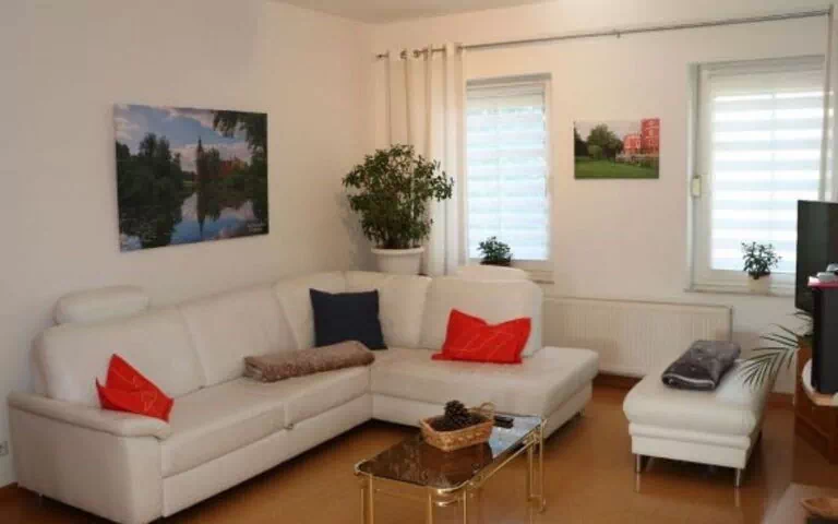The 2-room flat is located in a quiet residential area on the first floor of a holiday home in which there are two other holiday flats. The town centre and the train station are within walking distance.A large garden invites you to linger.The flat is approx. 45 m² in size and consists of the following rooms: A living room with LED TV (SAT-TV) and double sofa bed; a bedroom with double bed; a fully equipped kitchen with cooker, oven, microwave, coffee maker and dining area and an adjoining bathroom with shower and toilet. In the hallway there is another WC and a washing machine room.The property is fenced, a large garden with seating area and barbecue invites you to linger. The car park is located on the property. A secure bicycle room is located in the outbuilding.Bicycles can be hired for a fee.The 2-room flat is located near the railway station on a quiet side street. The town centre, lido and zoo are within walking distance. Numerous shopping facilities and restaurants are nearby.