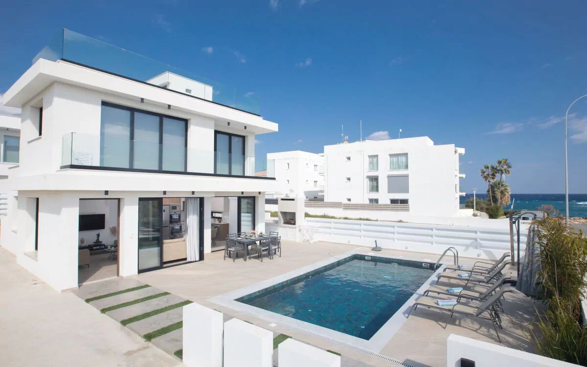 This charming and elegant villa is located in the Ayia Triada area, with the beach almost on your doorstep and just a few minutes drive to the resort centres of Kapparis, Pernera and Protaras. Its contemporary décor, comfortable furnishings and outstanding sea views, make this villa ideal for those looking for a relaxing and peaceful break.As you enter the villa, you will find the open-plan ground floor living room, kitchen and dining area, surrounded by large bi-fold patio doors that lead to the garden and pool area. The living room features a corner sofa and widescreen, Satellite TV; the dining area has a table and chairs to seat 6 people, and the kitchen is fully equipped with all appliances, utensils and cutlery needed for your self-catering stay, and includes a breakfast bar with extra seating for 2 people.One of the bedrooms with a double bed can also be found on this floor as well as one of the bathrooms with shower and WCUpstairs, you will find the two remaining bedrooms, one of which has an en suite bathroom with shower and WC. Both bedrooms have double beds, a shared balcony and offer stunning sea views. All bedrooms have fitted wardrobes and bedside cabinets.The main family bathroom is on this floor with shower and WC.On the 3rd level, you will find one of the added luxuries of the villa – the roof terrace with seating area, perfect for relaxing and unwinding with a drink whilst taking in and enjoying the views and sunset.There is full air con and WI-FI throughout the villaThis beautiful villa in a quiet location, just a minute walk to the beach, close to all amenities, yet far enough away to enjoy the tranquility, is the ultimate choice for those looking for a peaceful holiday somewhere that they can call ‘home from home.’Outside, the spacious garden features a barbecue and worktop area with built-in sink for those evenings at home and al fresco dining. There is also a shaded dining area, sunloungers and private pool, ideal for lazy days basking in the sun.