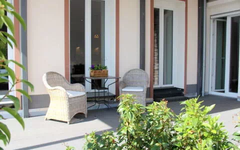 Here you can relax and enjoy yourself in comfort in a wonderful holiday flat right in Traben-Trarbach.This flat is in a quiet location in the centre of the Traben district, just a few metres from the Moselle promenade. Luxuriously furnished, you can expect a very stylish apartment with plenty of space, comfort and tranquillity. You can park conveniently in an outdoor parking space in the underground car park and the lift takes you comfortably to the floor of the flat. Shopping facilities are only a few metres away from the property. The apartment has a large living/dining area with an open-plan, fully equipped kitchen, a bedroom with a flat screen. Bathroom with walk-in shower, guest WC, utility room and an almost 30 square metre sun terrace with a view of Grevenburg Castle. You will want for nothing here. Shops and restaurants are just a few minutes' walk away. You will be welcomed directly by the owner.Fridge-freezer combination#+Glasses, crockery, pots, pansbread basket, boards, toaster,capsule machine, coffee machine, espresso machineelectric kettleDishwasherDining table with 6 chairsWriting desk2 cable TVsPatio table with 4 seats2 sun loungers, parasolsofa cornerLarge dining tablegreen terraceseparate G-WCelectric shutters in the bedroomlockable bicycle compartmentBicycle hire service on sitetowels, bed linenAn approx. 35 square metre sun terrace awaits you with greenery, 2 sun loungers, patio table with 4 high-back chairs and side table. There is also a parasol and the terrace is partially covered with a view of the Grevenburg.Quiet location in the centre of Traben - bakery for your breakfast rolls just 2 minutes' walk awayjust a few metres from the Moselle promenade, shops and restaurantsvery high-quality equipment and furnishingsBeautiful Moselle landscape, which combines the river, forests and vineyards into an idyllic symbiosis - here you can discover a wonderful little town with many historic art nouveau buildings, go hiking, on boat trips, cycle tours and enjoy many delicacies.