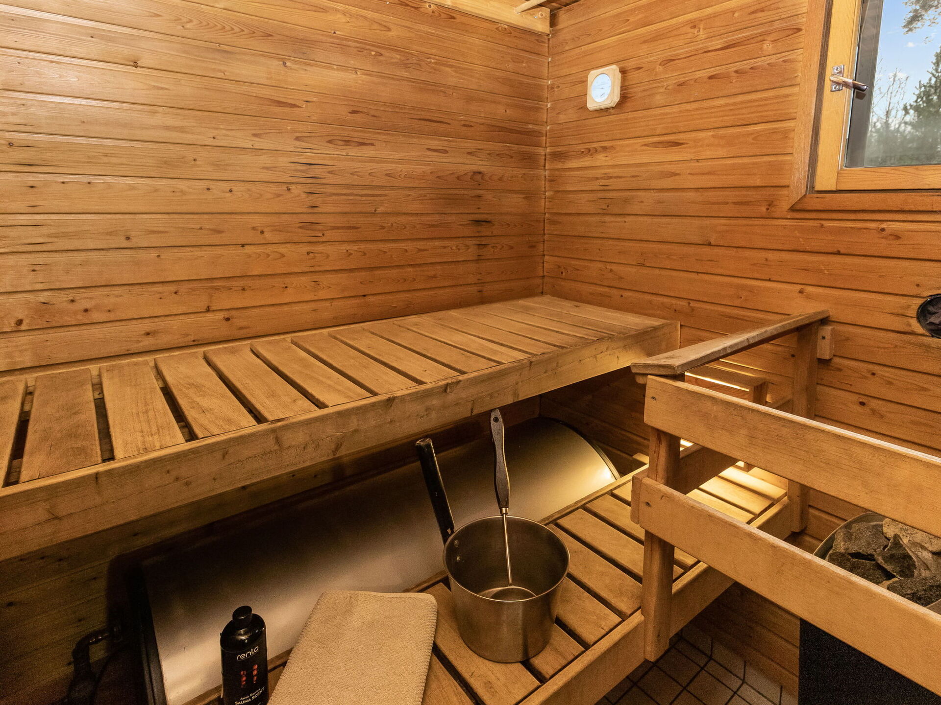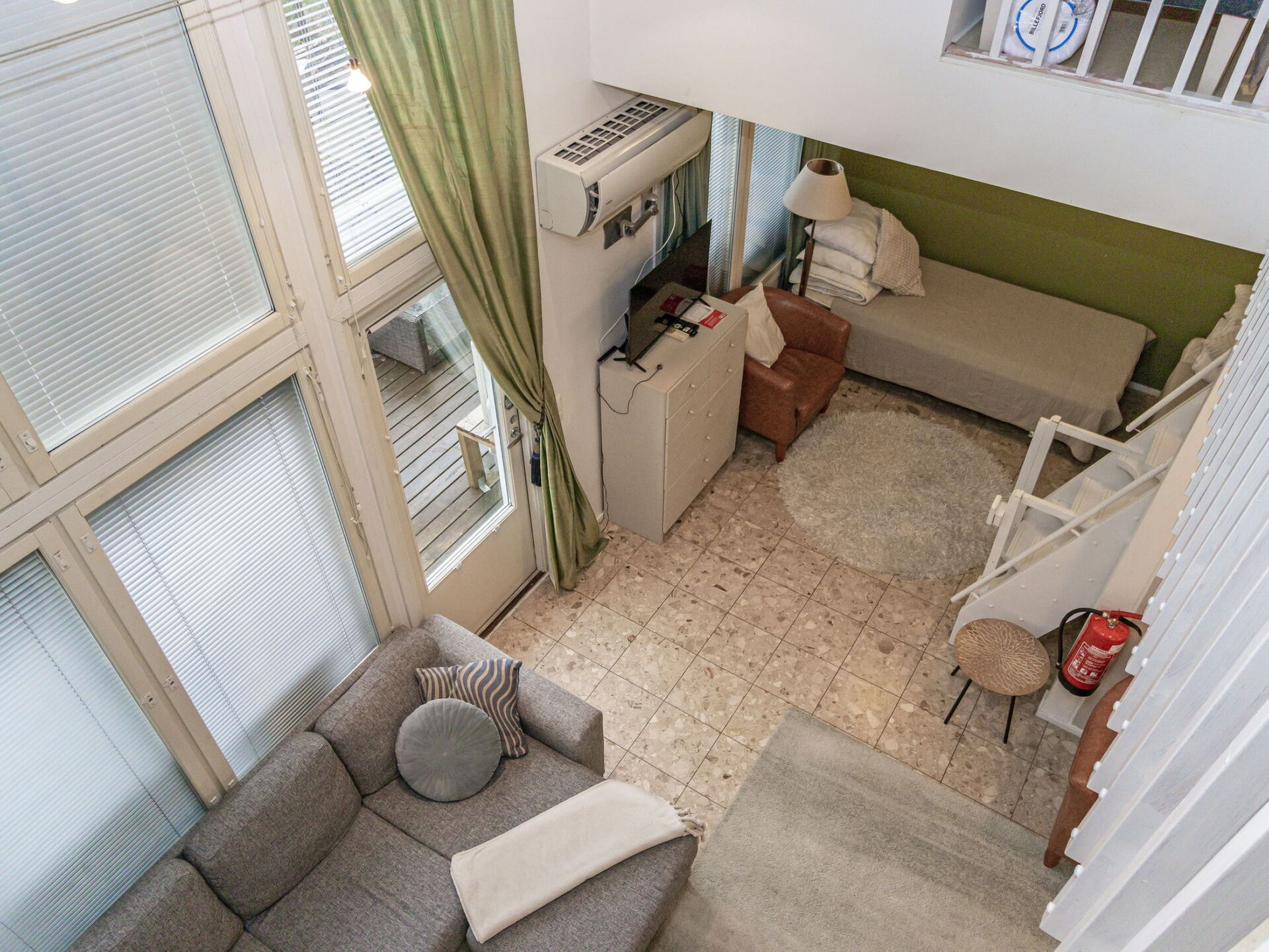 The ground floor of the apartment features a living room/kitchen, an electric sauna, a washroom with shower and WC, and two bedrooms where the beds can be separated. The living area has two separate beds, and the loft offers five additional single beds.