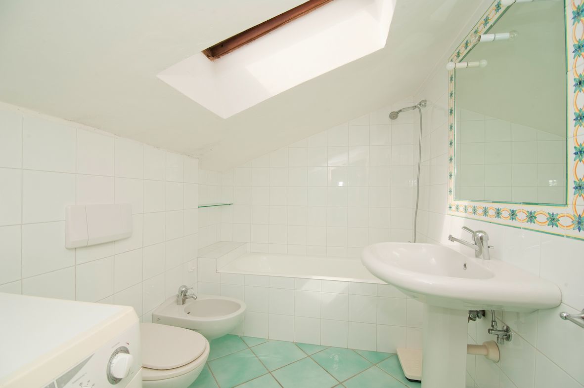 Nice wooden stairs take you to the attic ceiling which has a nice terrace, twin beds, a chest of drawers and a bathroom with buth-tub.