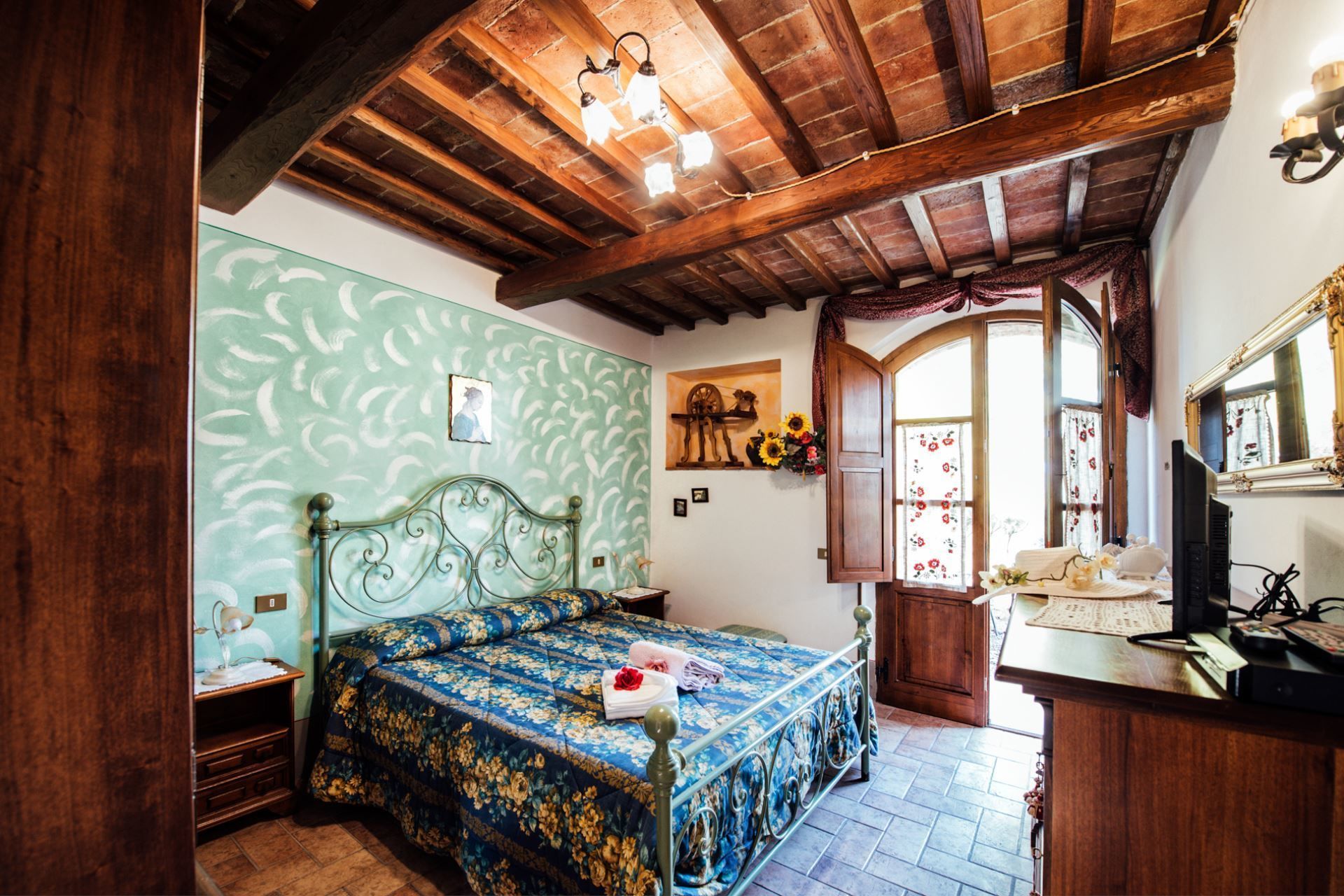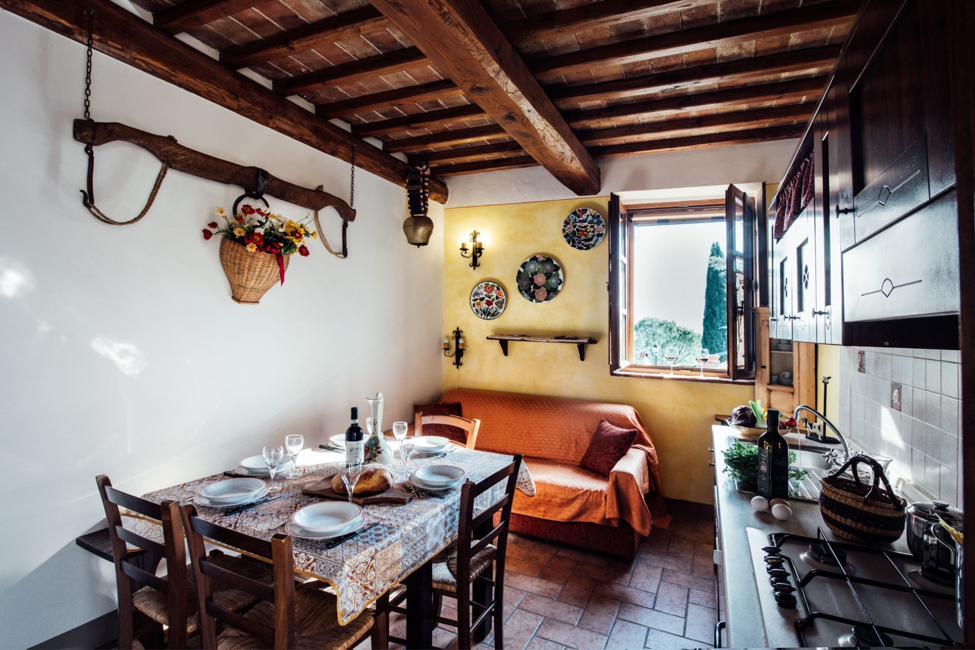 Ground floor apartment in the main house composed of living-dining room with kitchenette and French sofa bed, two double bedrooms, bathroom with shower.