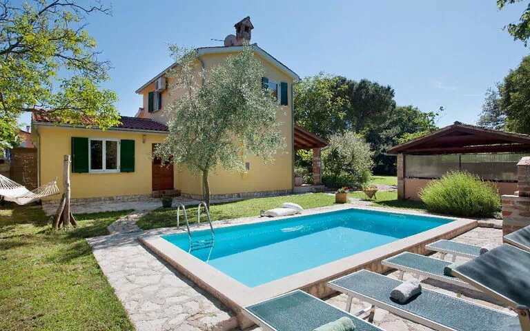Juricani 5 km van Umag: Mooi eengezinswoning "Casa Oliva", bouwjaar 1920, gerenoveerd. In het gehucht Kranzeti, 2 km van het centrum van Juricani, rustige, zonnige ligging, 7 km van zee. Voor medegebruik: terrein 700 m2 met gazon en bomen. Voor alleengebruik: terrein 200 m2 met bloemen en bomen, openluchtzwembad hoekig (6 x 3 m, 02.05.-03.10.). Terras, tuinmeubelen, barbecue. In het huis: internetaansluiting, wasmachine. Parkeerplaats bij het huis op het terrein. Winkel 2 km, restaurant 5 km, kiezelstrand 7 km, rotsstrand 7 km. Golfterrein 20 km, sportcentrum 7 km. Let op: object referentie: HR2225.201.1 is gelegen op hetzelfde terrein.