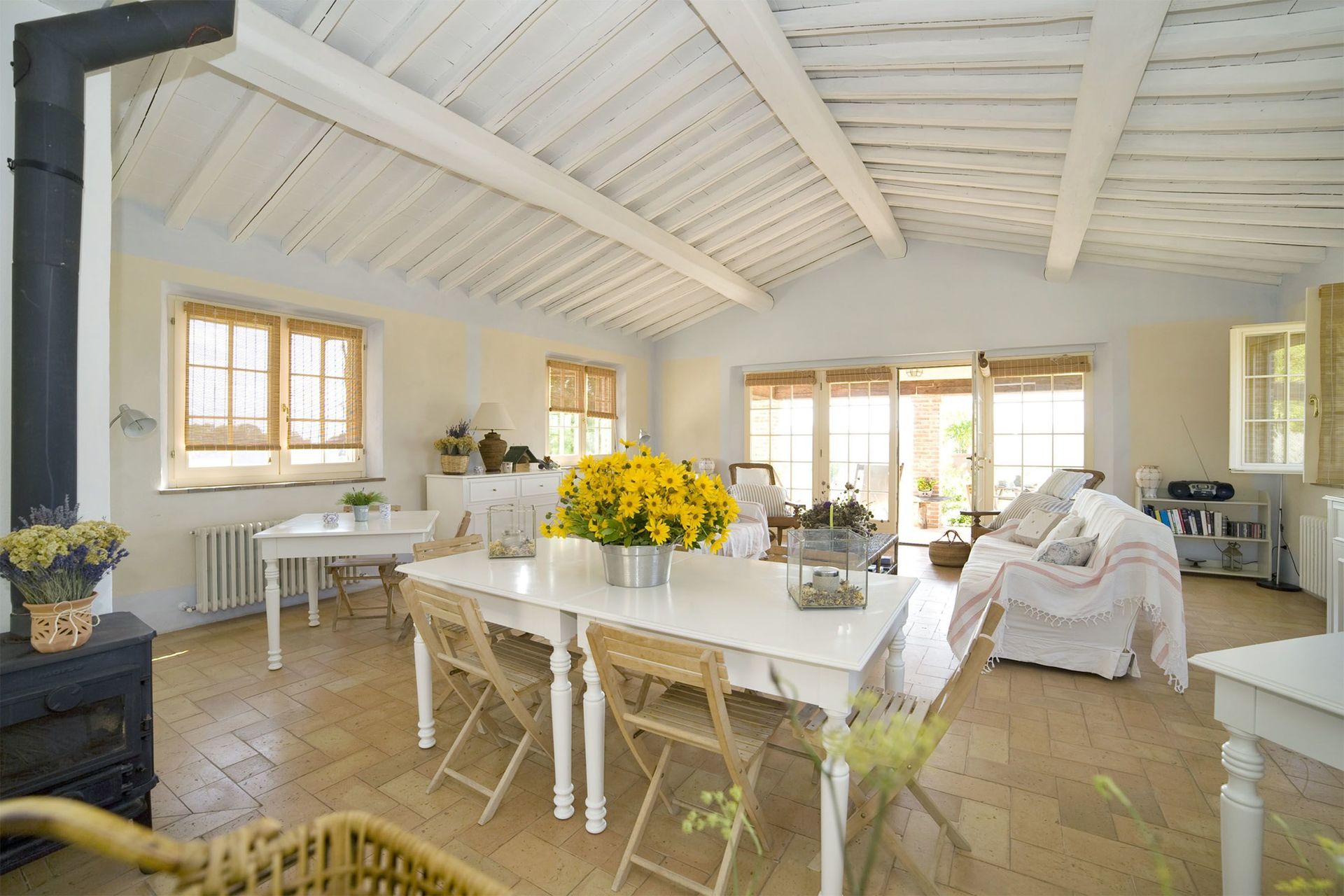 Keuken – woonkamer: goed uitgeruste keuken, vier eettafels (personen: 10), vaatwasser, ijskast, magnetron, kookplaat, houtkachel, oven, italiaans koffiezetapparaat, twee banken (personen: 6), twee fauteuils, WIFI internet, ventilator, stereo , uitgang naar de tuin.