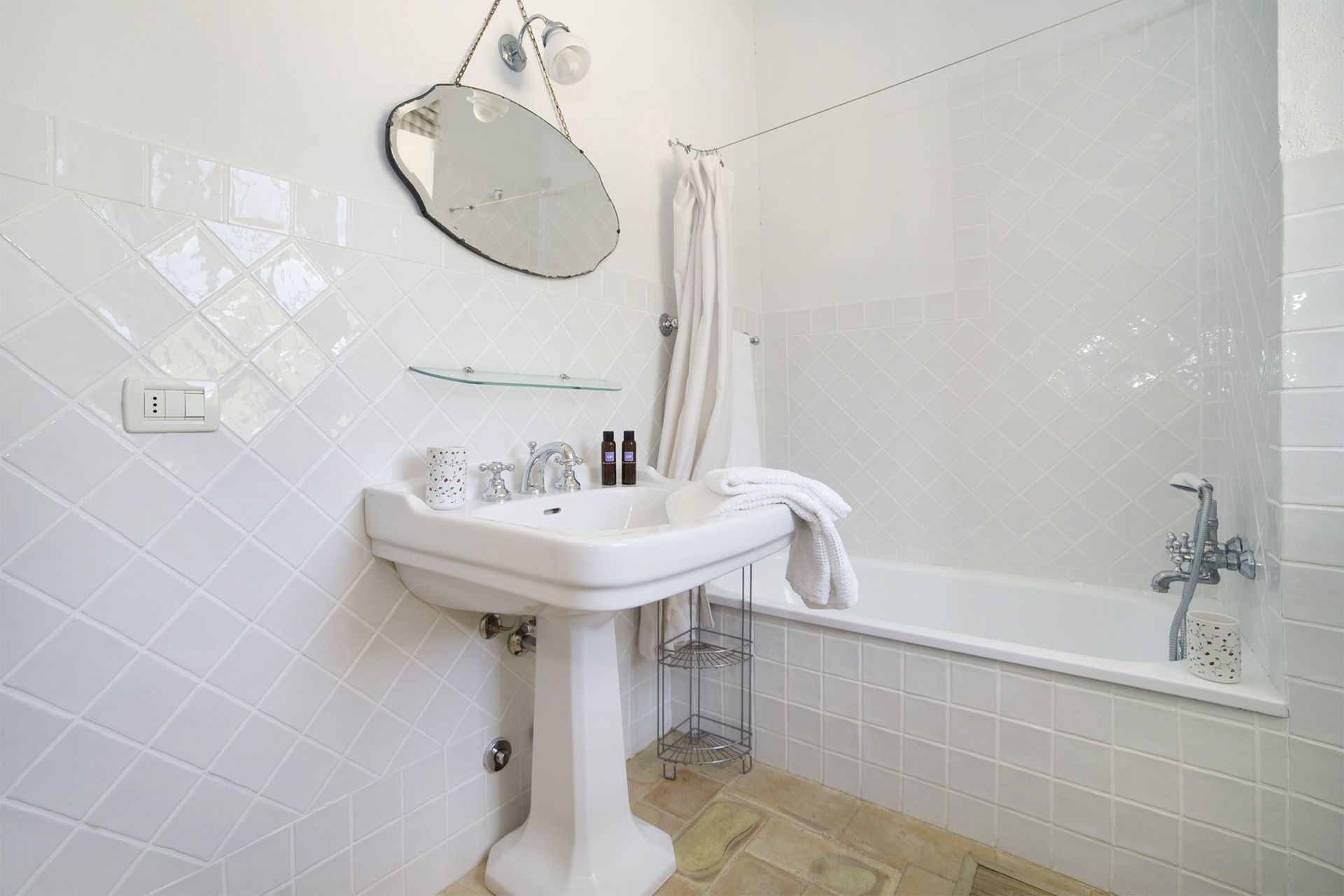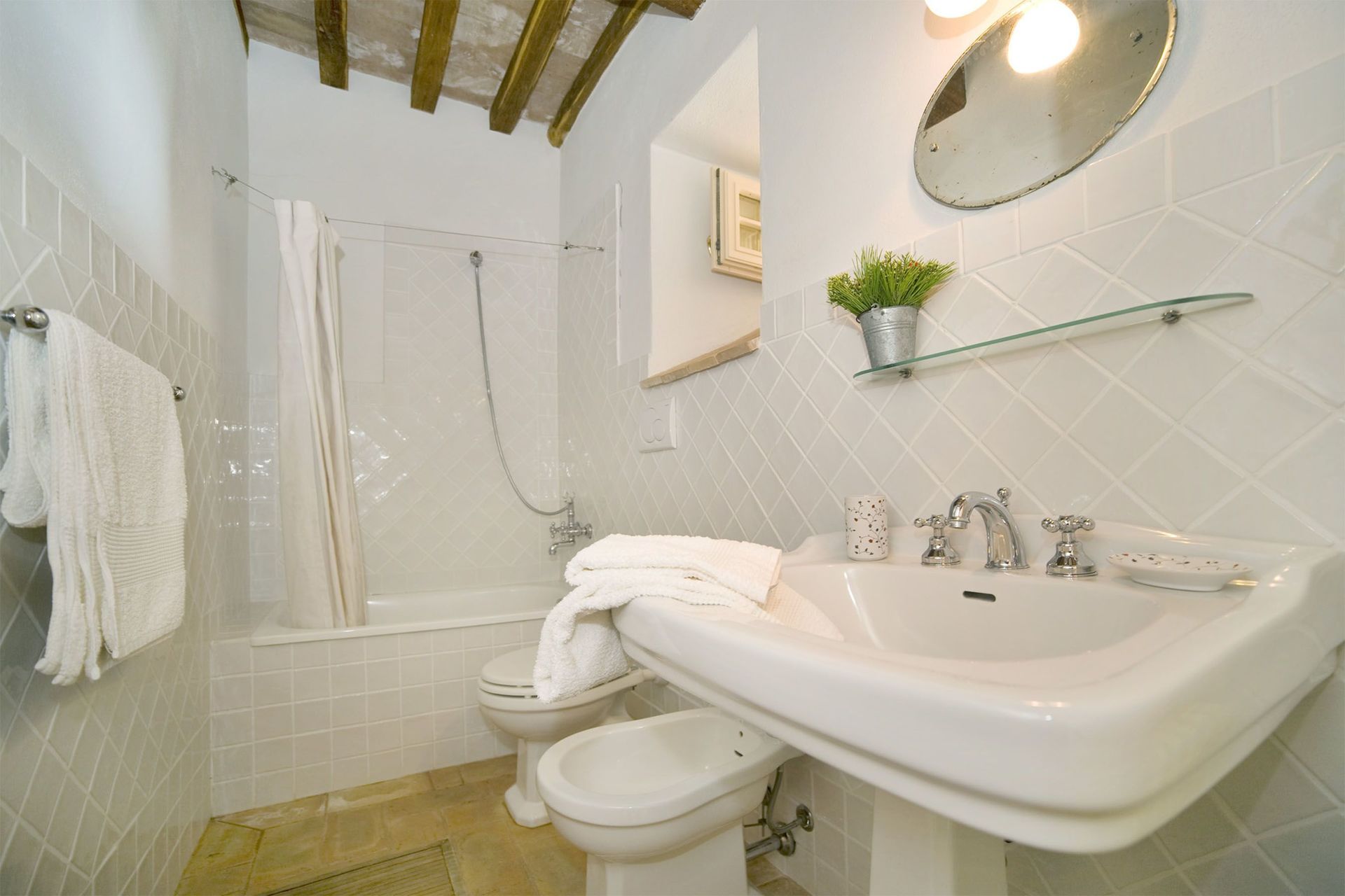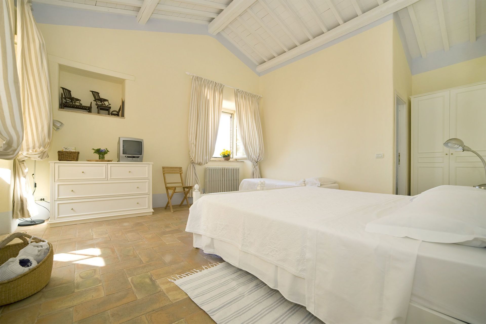Slaapkamer met badkamer 2: twee eenpersoonsbedden, WIFI internet, hor, ventilator, wastafel, toilet , bidet, bad, haardroger.