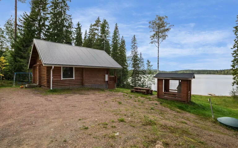 Log cottage 2010, living room/kitchen 2 extra beds, bedroom double bed, washroom, sauna, hall, porch. Upstairs: bedroom 3 beds, lounge, balcony. Cottage located on slope, grassed area between cottage and shore. Yard with woodshed.