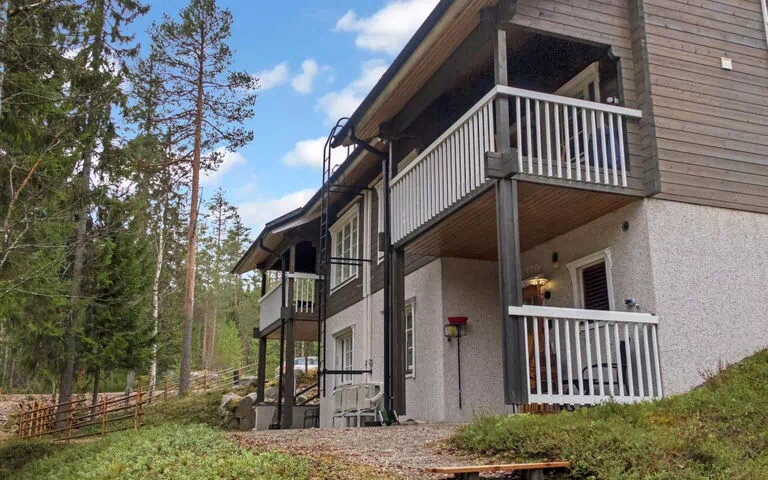 This downstairs suite is in a log house in Vuokatti ski centre was completed in 2003. Floor area 26 m². One room with kitchenette and living room/bedroom with 2 beds, motor beds. Sauna (electric), washroom/toilet. Internet connection (wireless, speed 1MB). Kajaani 33 km, Sotkamo 7 km, Vuokatti ski slope 100 m, cross country track 50 m. Beach 1,5 km. Cleaning not included, cleaning booked in advance 47 €. Linen booked in advance 13 €/person. No pets allowed.