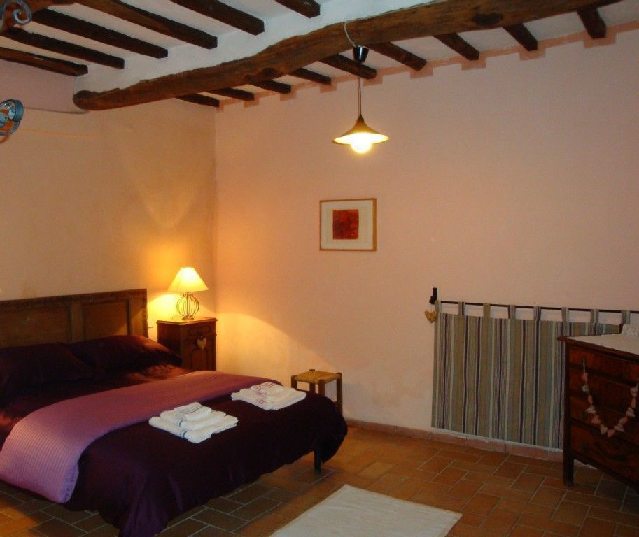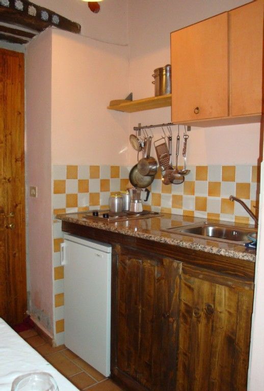 Living room with kitchen corner (sink, a small fridge and a double electric hot plate), 1 bedroom with double bed and 1 single bed, 1 bathroom with shower.