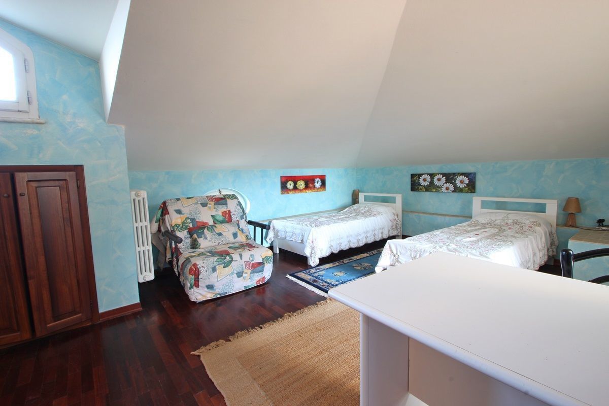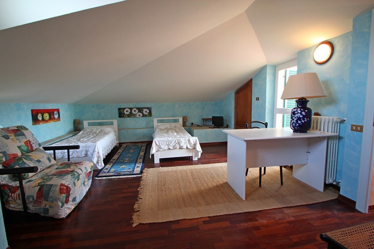 Second Floor (attic): large open space with three single beds and a TV. Bathroom with shower and small room used as a closet.