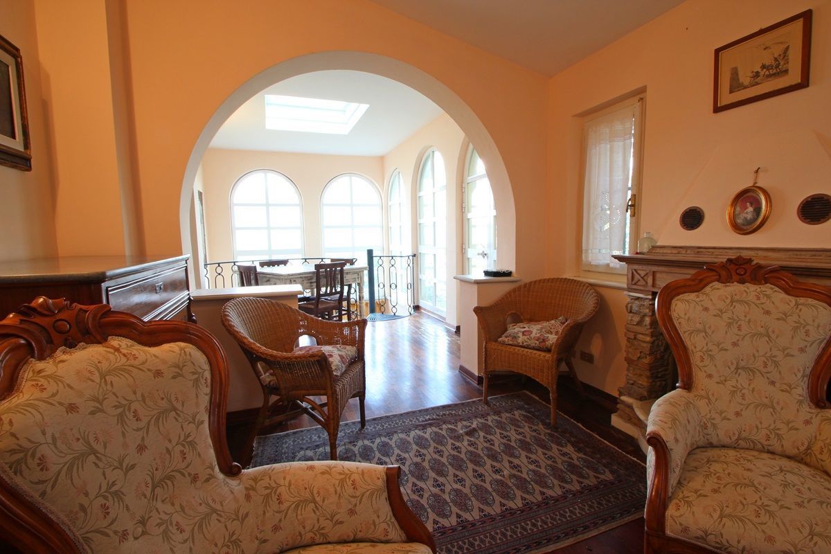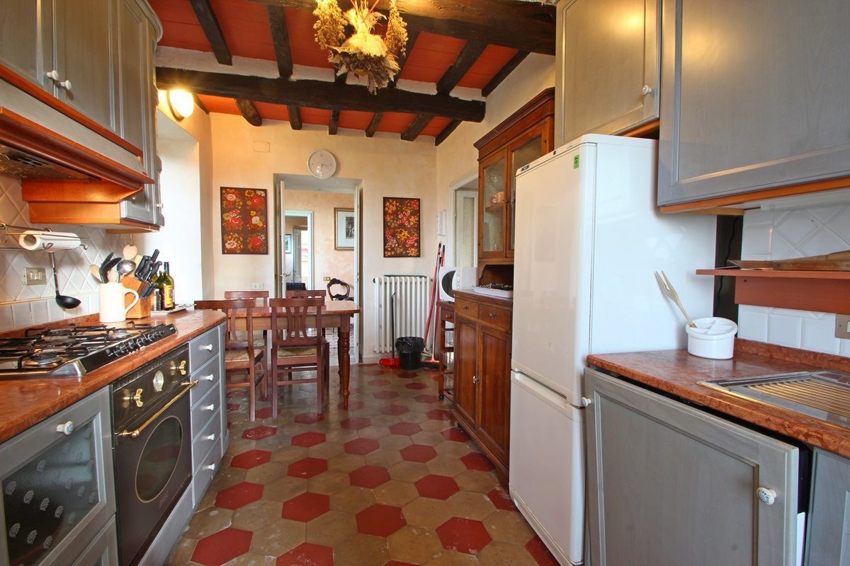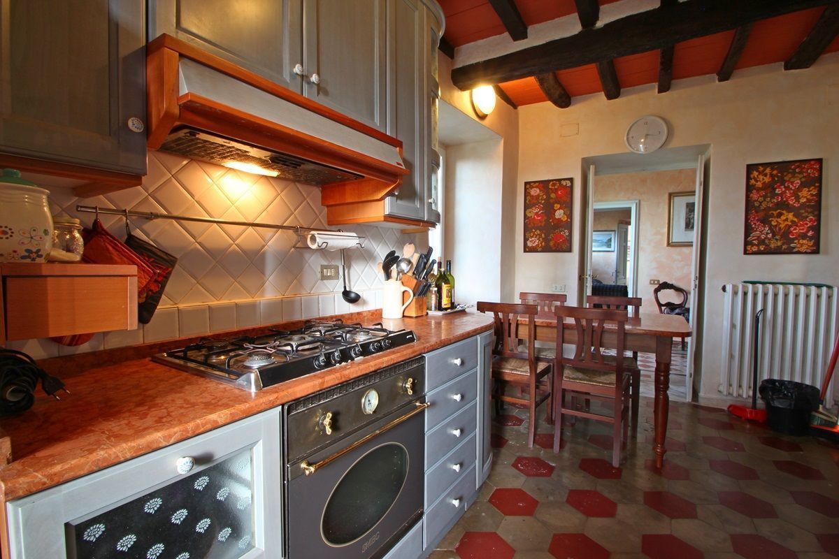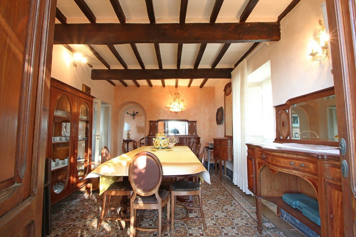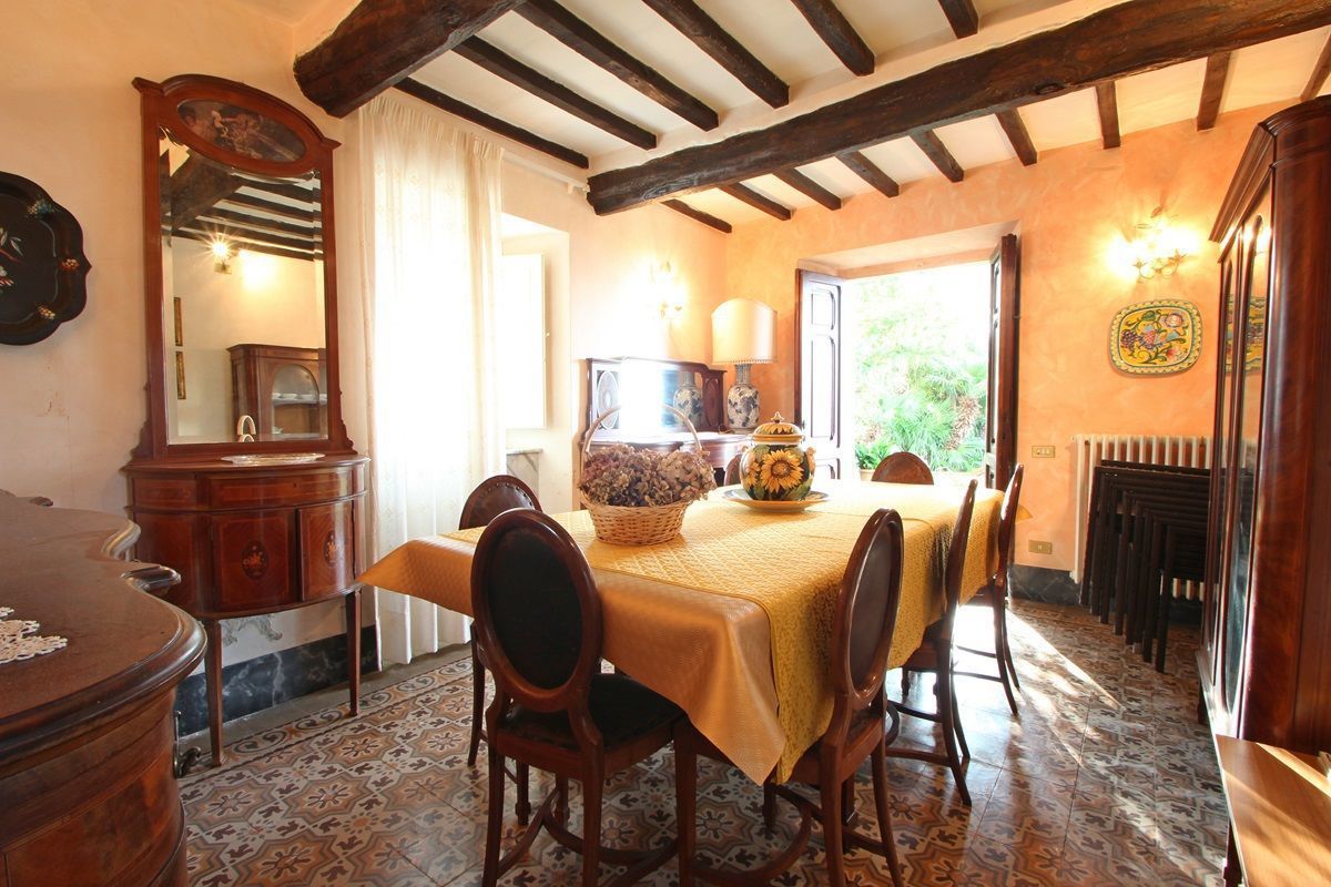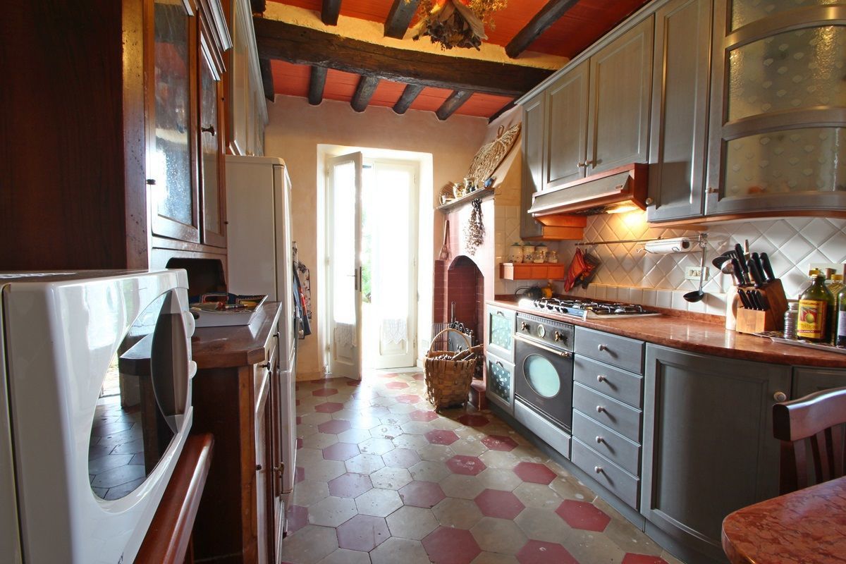 The right side of the villa is the one dating back to the 19th century with exposed beams and consists of the kitchen with fireplace, dishwasher, oven, microwave, refrigerator, 5 burner cooking and door to the garden with table, barbecue and then the dining room with seating for 8 people and also exit to the garden.