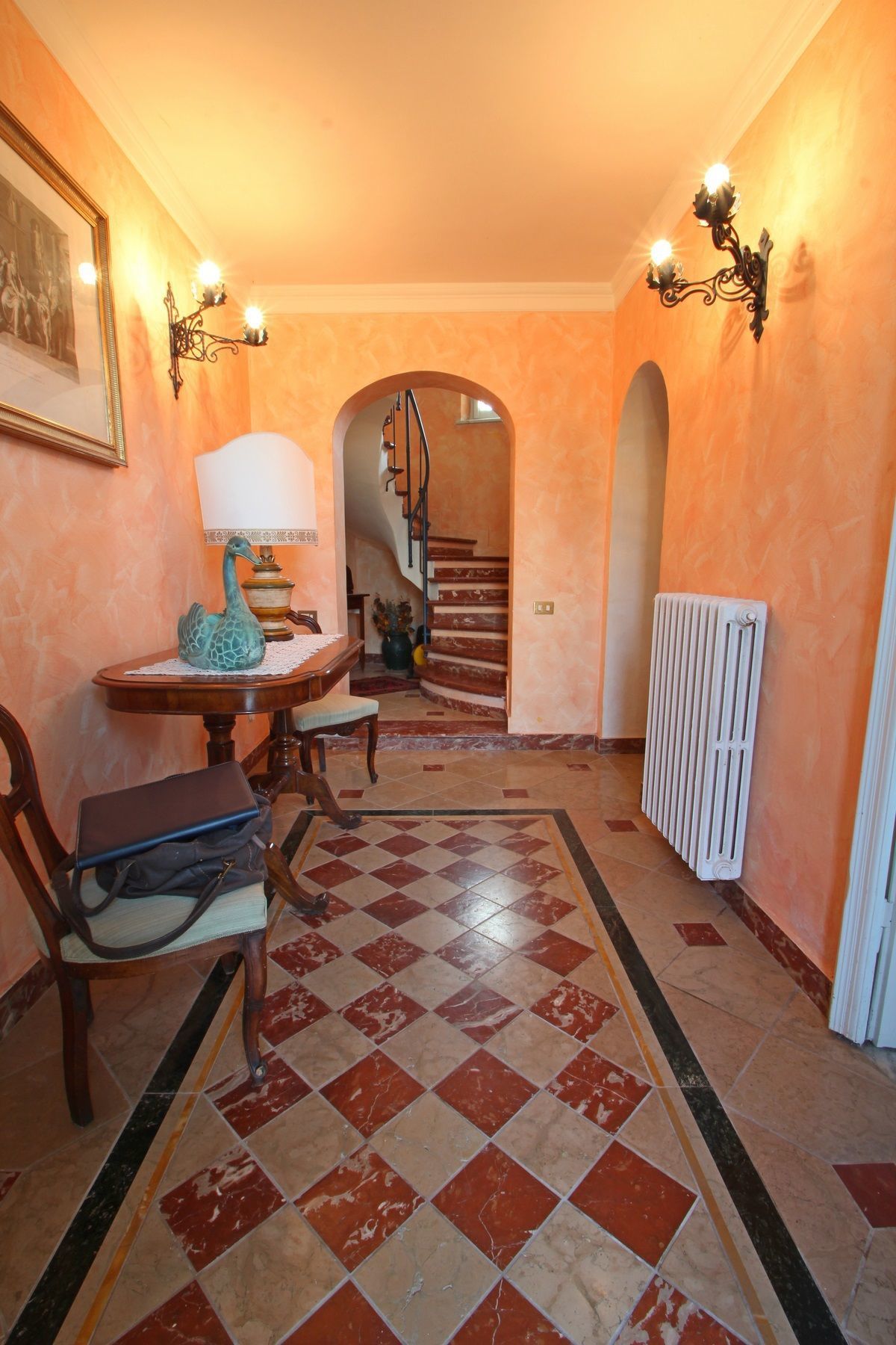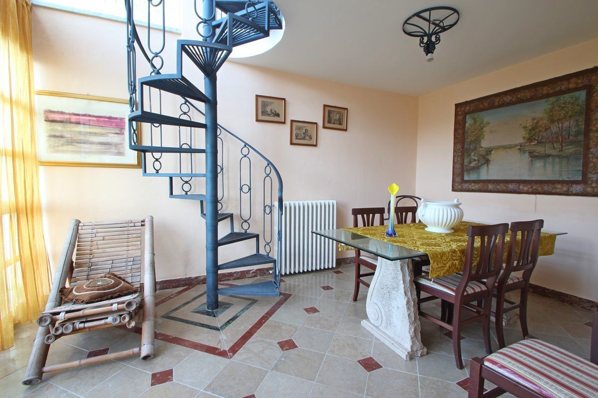 On the left side instead we find a room with sofas and a TV with satellite connection and a winter garden with dining table for 6 and a spiral staircase that leads upstairs. From that corridor on the ground floor of Villa Stefano we reach also a small bathroom and large stairs leading to the upper floors.
