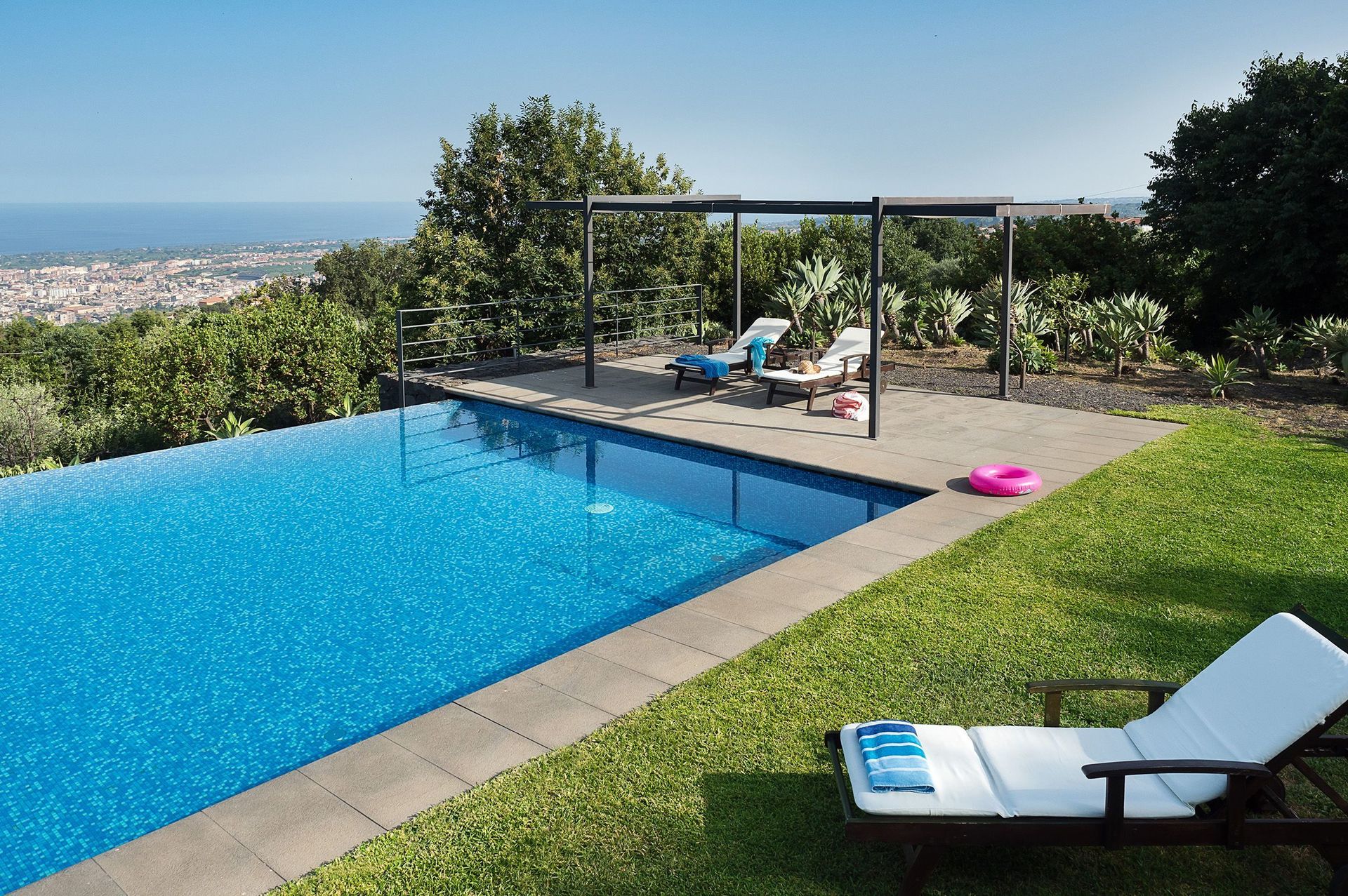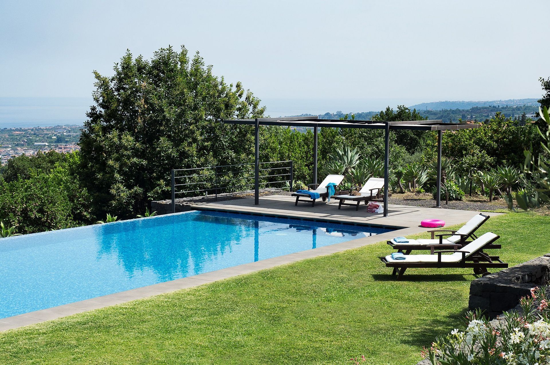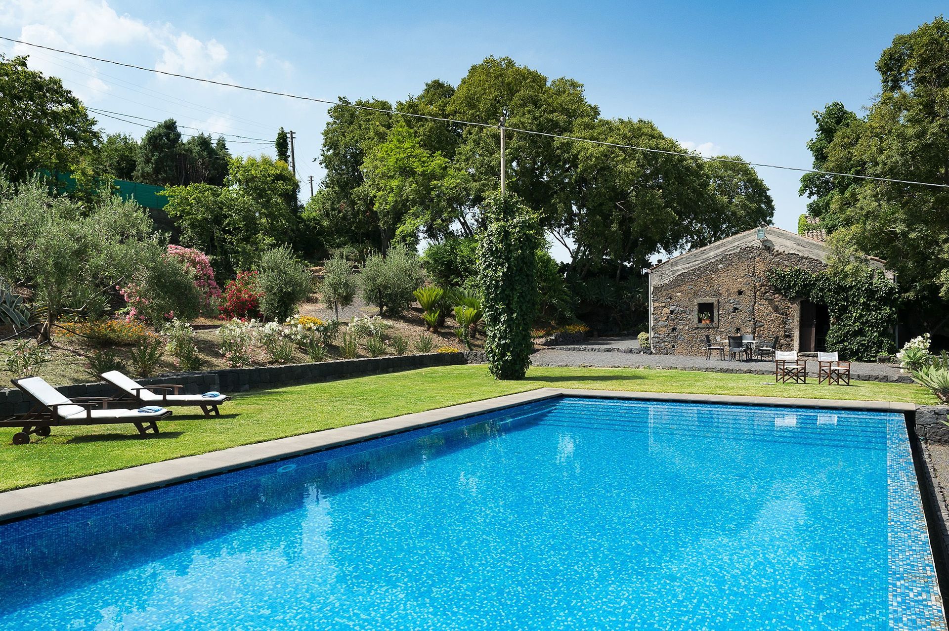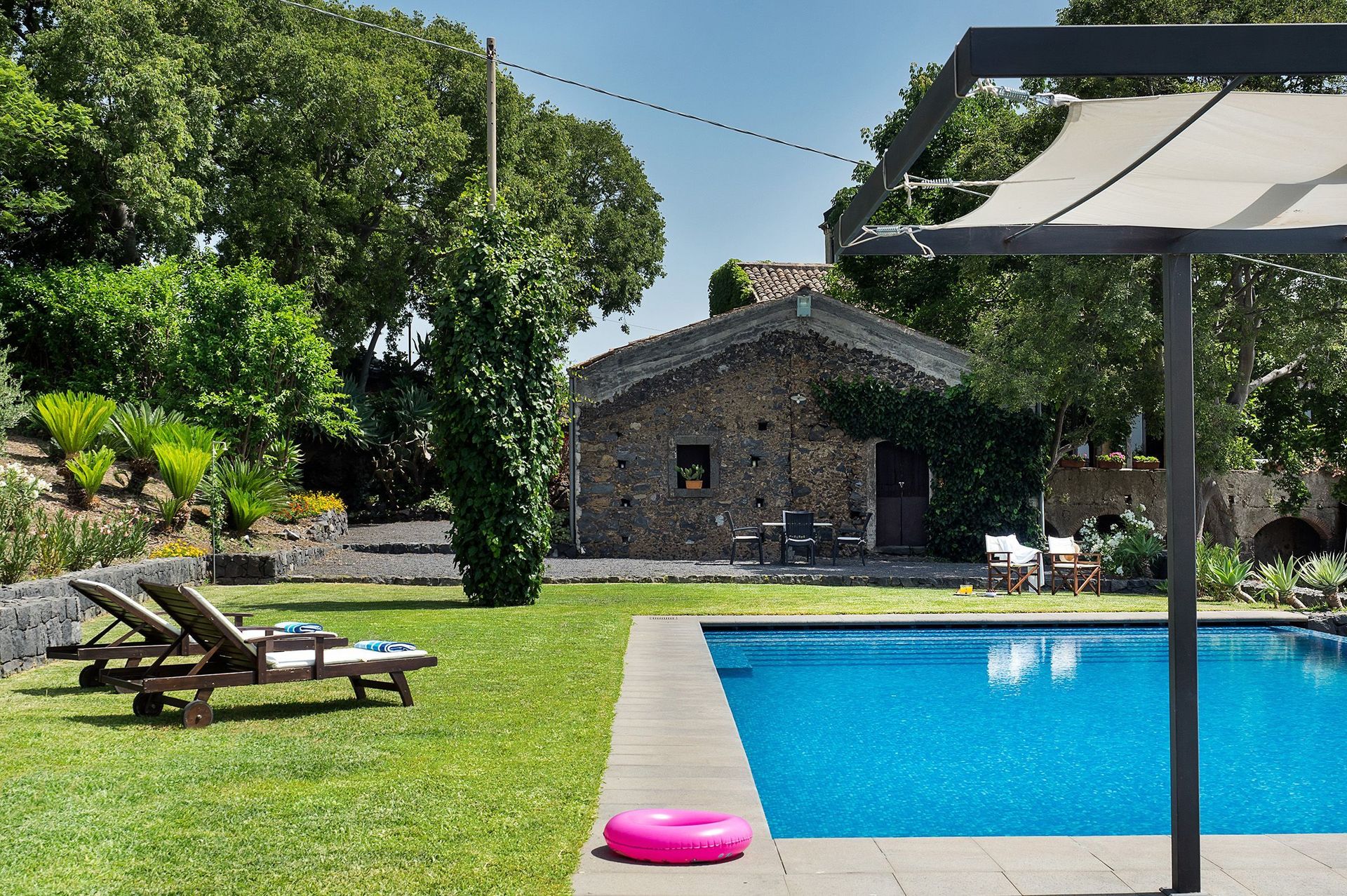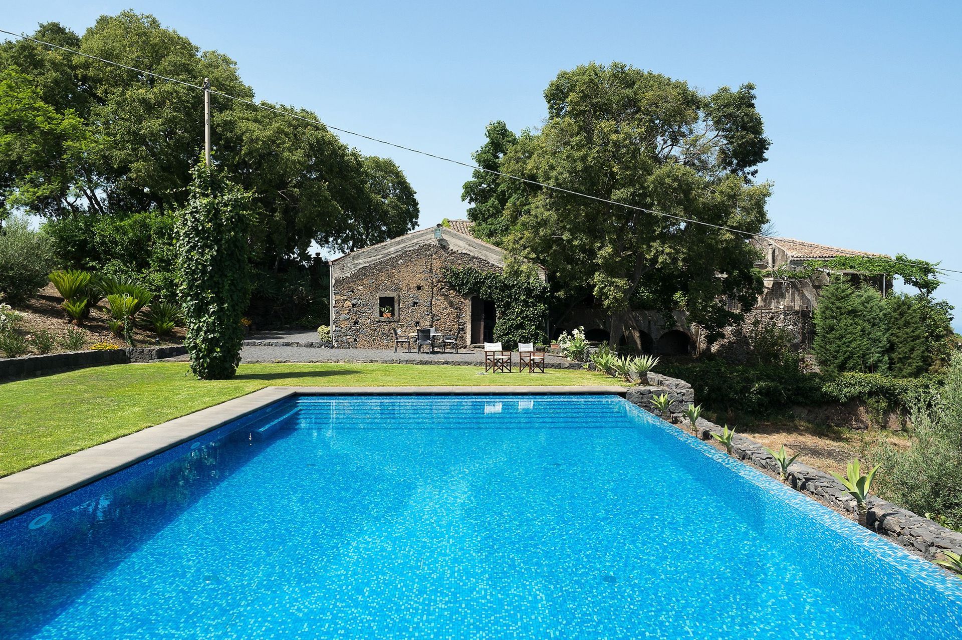 On the slopes of Mount Etna, amongst lemon trees descending towards the sea, nestles this charming farmhouse with private pool. Set in a commanding position, Montebello enjoys magnificent views towards the sea and the cost between Taormina and Acireale. Recently and accurately restored it is the oldest part of the complex, consisting of the manor house, a wine press and various agricultural buildings. Great care was taken to preserve the character and charm of this dwelling. Dating back to 1700, it retains many of its original exterior and interior architectural features. The interior decoration, featuring terracotta floor tiles and select antiques, creates a warm and cosy atmosphere. Each room contains elements of traditional Sicilian style, such as the kitchen decorated with artisan-made ceramic tiles. Beautifully sitting in the surrounding landscape, this dwelling offers plenty of space and panoramic terraces overlooking the garden with lawn and Mediterranean plants and the pool, perfect for relaxation. Montebello is an excellent starting point for exploring the Etna park and its villages, through interesting excursions and delicious wine and gastronomy tours. Also Catania, Acireale and the enchanting "Riviera of the Cyclops" are easily reachable by car.