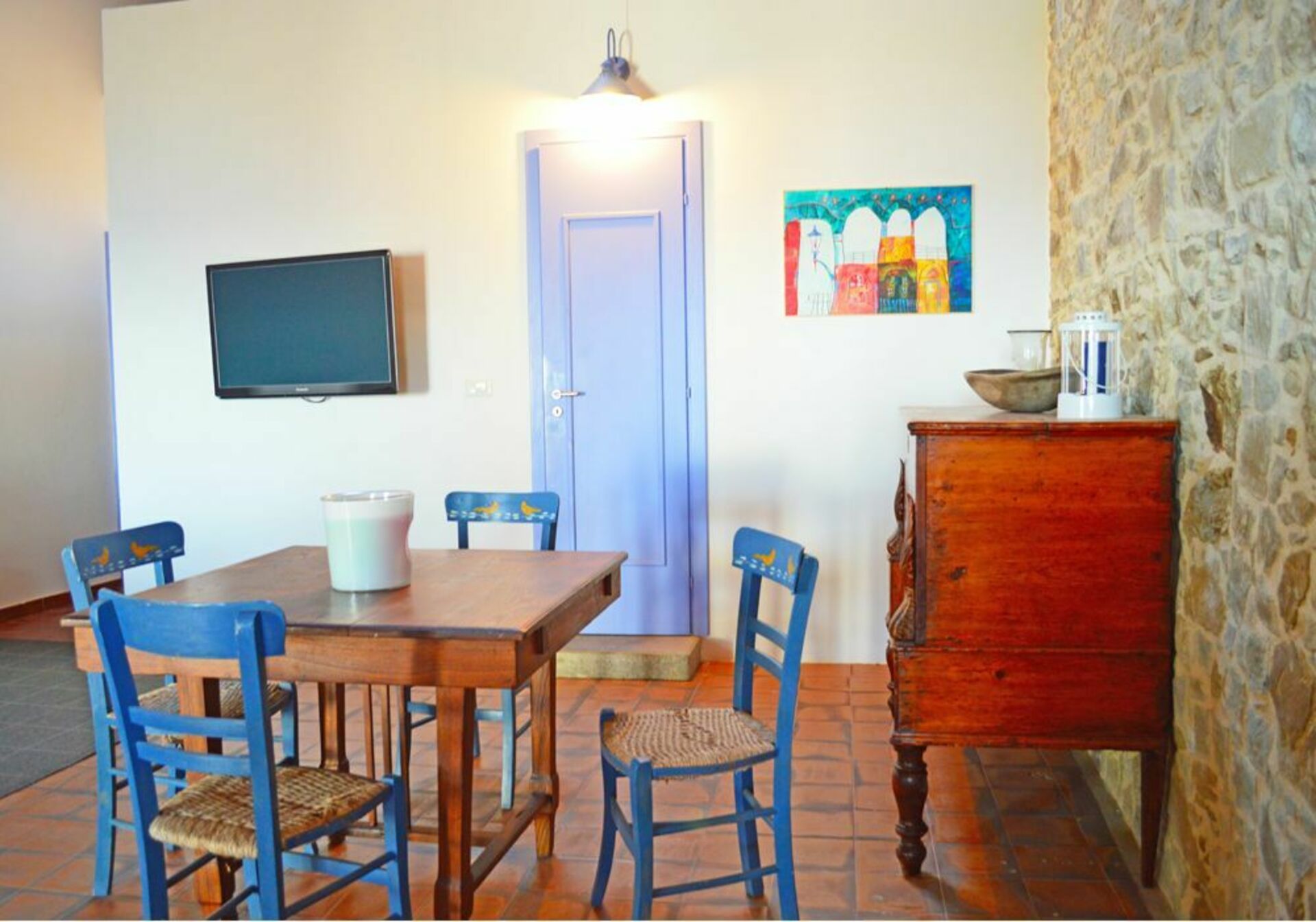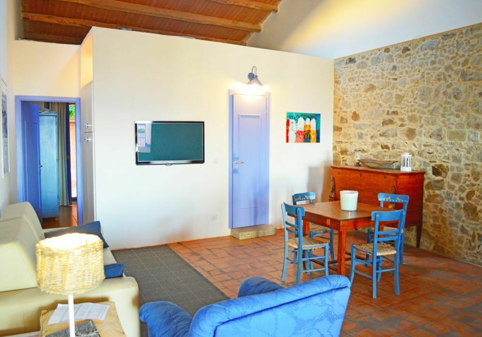 Private entrance, living room with kitchen corner, 1 double sofa bed and 1 single sofa bed, dining table, TV.